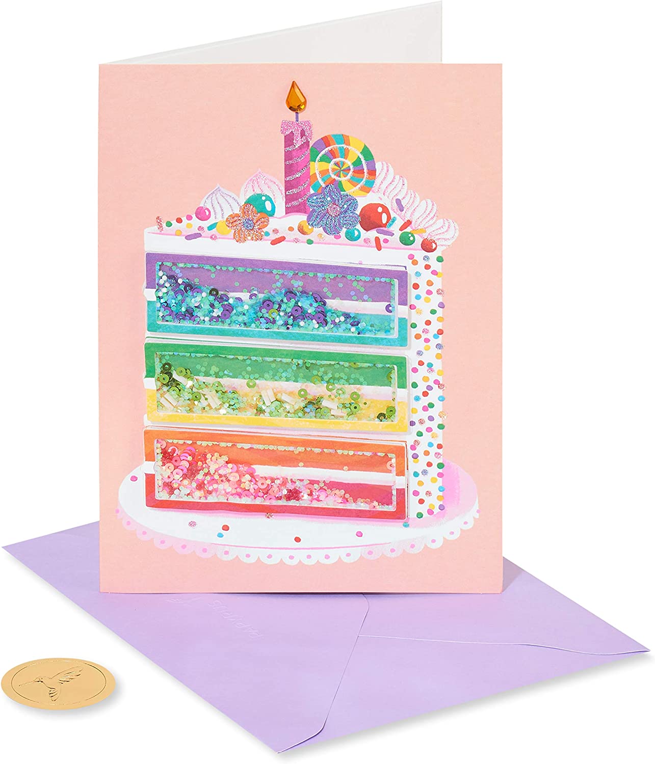 Hooray for birthdays! Three cheers – one for each layer of fun on this bright and celebratory birthday card by Papyrus. A big piece of cake takes center stage on this colorful design with lots of extra embellishments like glitter, embossing, gems, sequins and beads secured behind a clear plastic overlay, and dimensional paper attachments. Like the perfect birthday, it’s a little over the top in all the best ways, and it’s fun to send to anyone who deserves some bigtime birthday cheer. Includes lavender envelope with colorful polka dot lining and a classic gold seal. Extra postage is required.