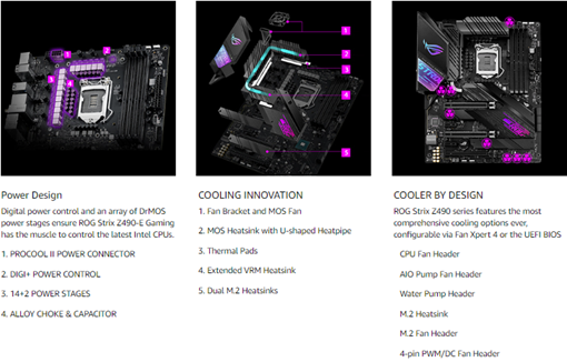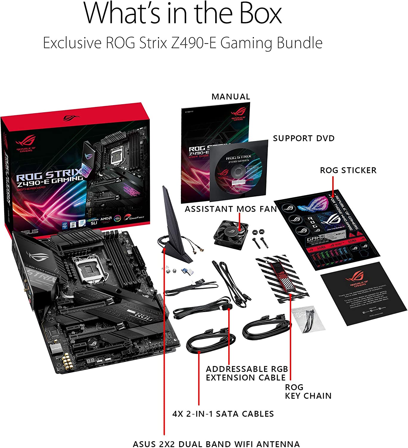 The ROG Strix Z490-E (WiFi 6) Gaming motherboard is designed to cope with the demands of 10th Generation Intel Core processors, with boosted power delivery and an optimized cooling design providing more surface area for heat dissipation. ROG Strix Z490-E Gaming features AI enhancements and intuitive dashboards to help you overclock and tweak various parameters easily