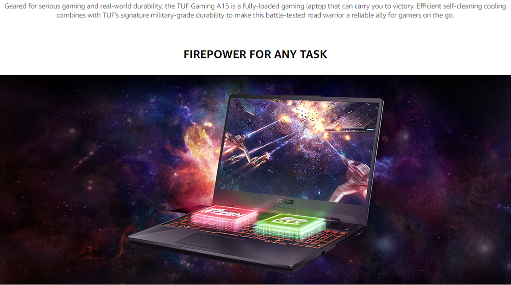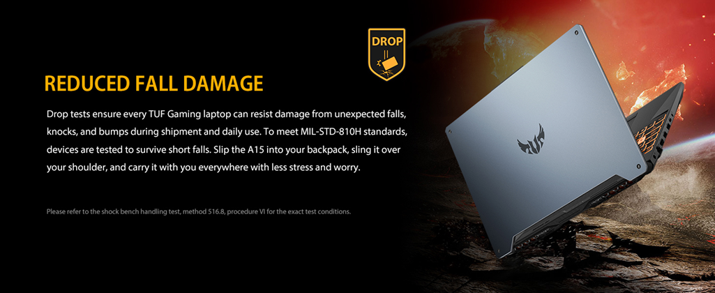 ASUS TUF Gaming TUF506 is a powerful Windows 10 gaming laptop that combines gaming performance with up to a narrow bezel 144Hz IPS-type panel and an extended lifespan, thanks to its patented Anti-Dust Cooling (ADC) system. Equipped with NVIDIA GeForce graphics, octa-core AMD Ryzen processor, and solid-state storage. TUF506 is able to play the latest games and multitask with ease. TUF506 features one of the fastest Wi-Fi standards available — the latest Intel Wave 2 Wi-Fi 5 (802.11ac) boasts data transfer rates of up to an incredible 1.7Gbps. To top it all off, it’s RGB backlit gaming keyboard is rated at 20-million keystroke durability.The actual transfer speed of USB 3.0, 3.1 (Gen 1 and 2), and/or Type-C will vary depending on many factors including the processing speed of the host device, file attributes and other factors related to system configuration and your operating environment.