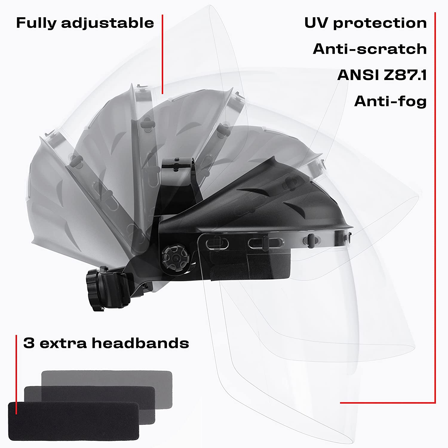 CLEAR PLASTIC FLIP UP FACE SHIELD. This high-quality, transparent face shield with durable aluminium metal hinges provides full face protection. It keeps stray particles, spitting, spray, splashes, and other unwanted things away from your eyes, mouth and nose. Great for men, women, teens, and even children. Fits any head from 20" circumference.