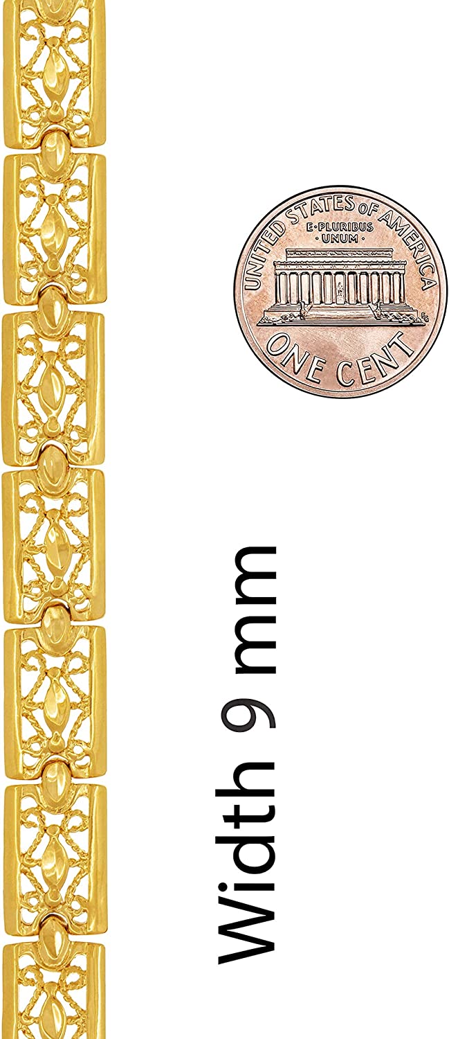 ? This 9mm ( ~ 3/8 inch ) Filigree Bracelet for women is MADE TO LAST with up to 20X more 24 karat gold plating than other electroplated fashion jewelry; This elegant bracelet makes a statement with its intricate and delicate design; Choice of yellow or white gold (rhodium)