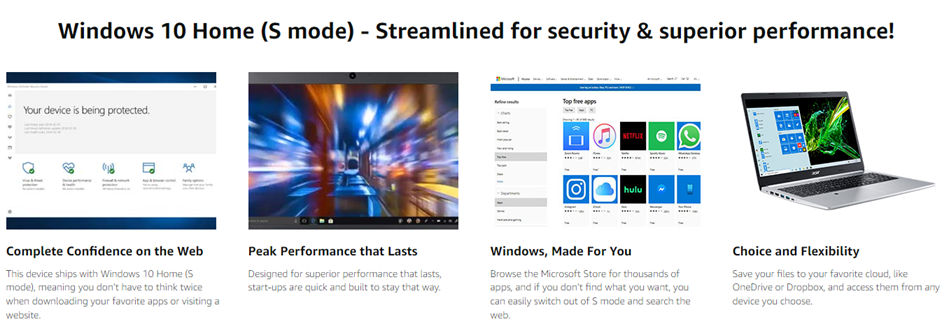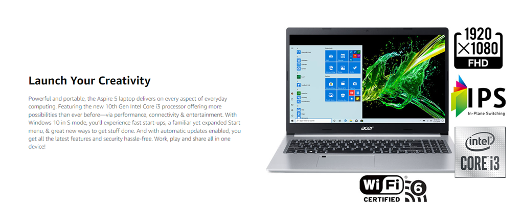Acer Aspire 5 A515-55-56VK comes with these high level specs: 10th Generation Intel Core i5-1035G1 Processor 1.0GHz with Turbo Boost Technology up to 3.6GHz (6MB Smart cache), Windows 10 Home, 15.6" Full HD (1920 x 1080) widescreen LED-backlit IPS Display, Intel UHD Graphics, 8GB DDR4 Memory, 256GB PCIe NVMe SSD, 1 - Available Hard Drive Bay, True Harmony Gen 2 Technology, Two Built-in Stereo Speakers, Acer Purified.Voice Technology with Two Built-in Microphones, Intel Wireless Wi-Fi 6 AX201 802.11ax Dual-Band 2.4GHz and 5GHz featuring 2x2 MU-MIMO technology (Max Speed up to 2.4Gbps), 10/100/1000 Gigabit Ethernet LAN (RJ-45 port), Bluetooth 5.0, Back-lit Keyboard, Acer Fingerprint Reader supporting Windows Hello, HD Webcam (1280 x 720), 1 - USB 3.1 (Type-C) Gen 1 port (up to 5 Gbps), 2 - USB 3.1 Gen 1 Port (one with Power-off Charging), 1 - USB 2.0 Port, 1 - HDMI Port with HDCP support, Lithium-Ion Battery, Up to 8-hours Battery Life, 3.97 lbs. 1.8 kg (system unit only) (NX.HSPAA.004).