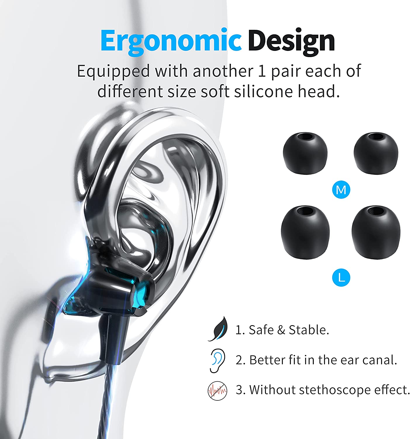 [Ergonomics Design]: The earphones are ergonomically designed, flexible, lightweight, allowing you to comfortably wear for long periods of time, the ear tips are soft and excellent quality, it comes with two additional different sizes of buds (M/L), you can choose the better buds to fit your ears.