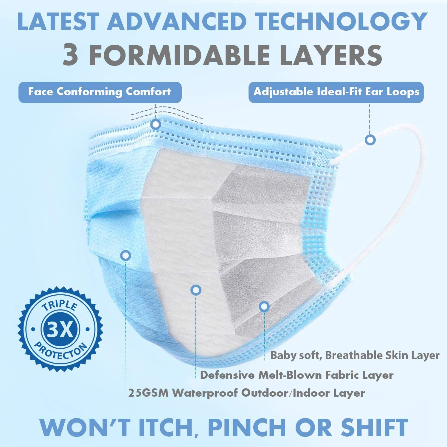 ✅ 3 POWER FACE COVER LAYERS - WON’T SCRATCH, TUG OR PINCH: BABY SOFT SKIN layer feels silky for all day wear (25gsm Double S non-woven fabric). GLOBALLY TESTED Melt-Blown Center Layer acts like a protective medical mask barrier. 25GSM, WATERPROOF outdoor mask layer blocks microscopic water sized molecules (like airborne aerosol).