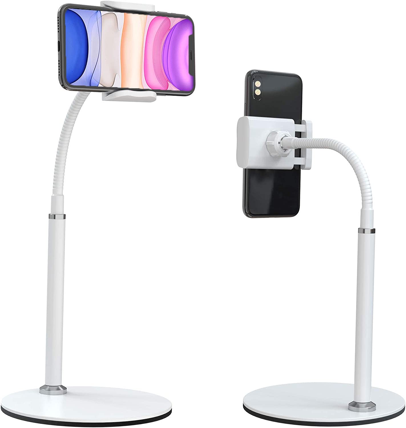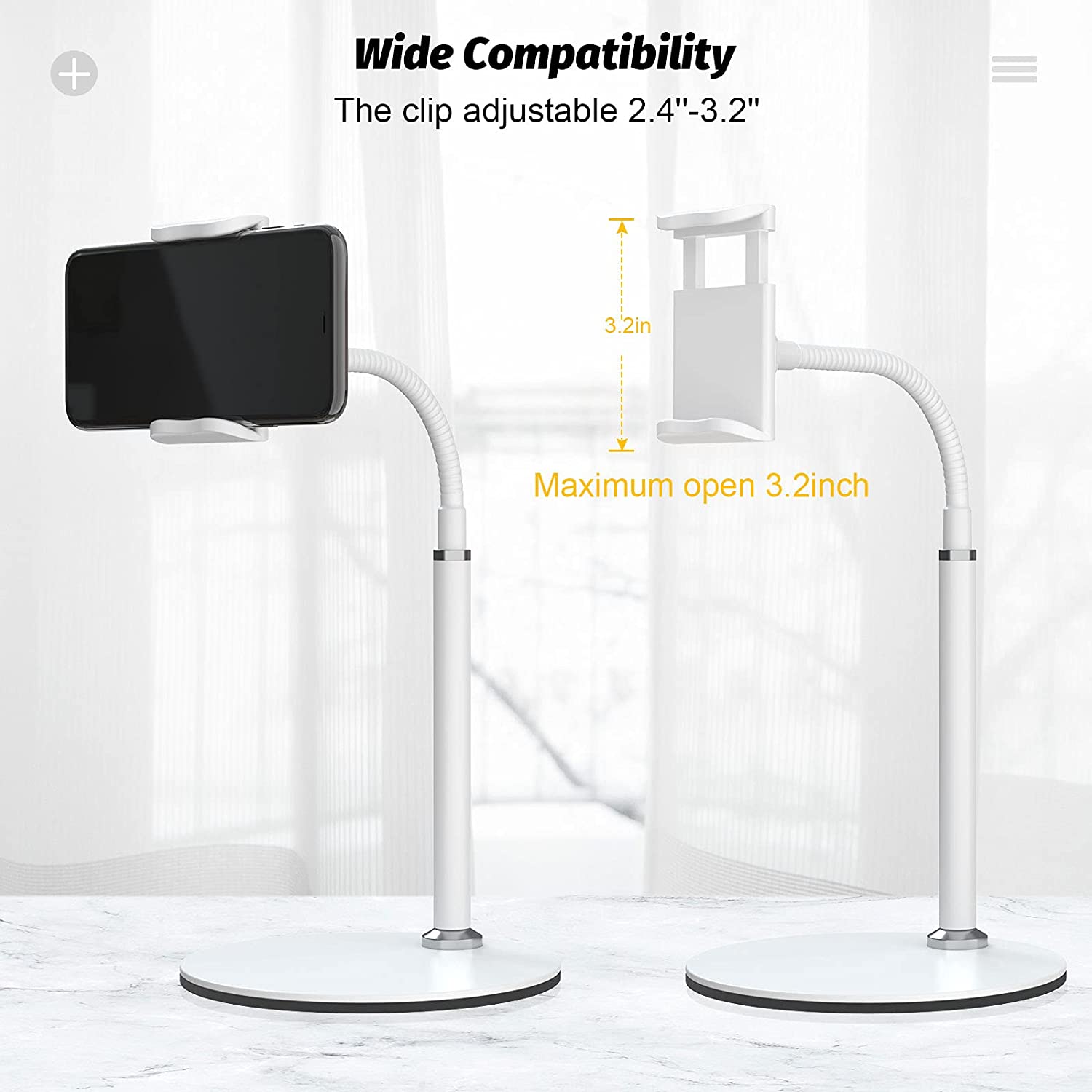• ? 【 Height & Angle Adjustable 】: The phone stand for desk has a flexible 15 cm gooseneck arm with a 360-degree swivel ball head that provides a multi-directional viewing angle. The height can be easily adjusted between 22.7 cm- 31 cm .You can easily adjust to a comfortable angle under any circumstances for convenience for every viewing which helps to fix your posture and reduce neck & back strain.