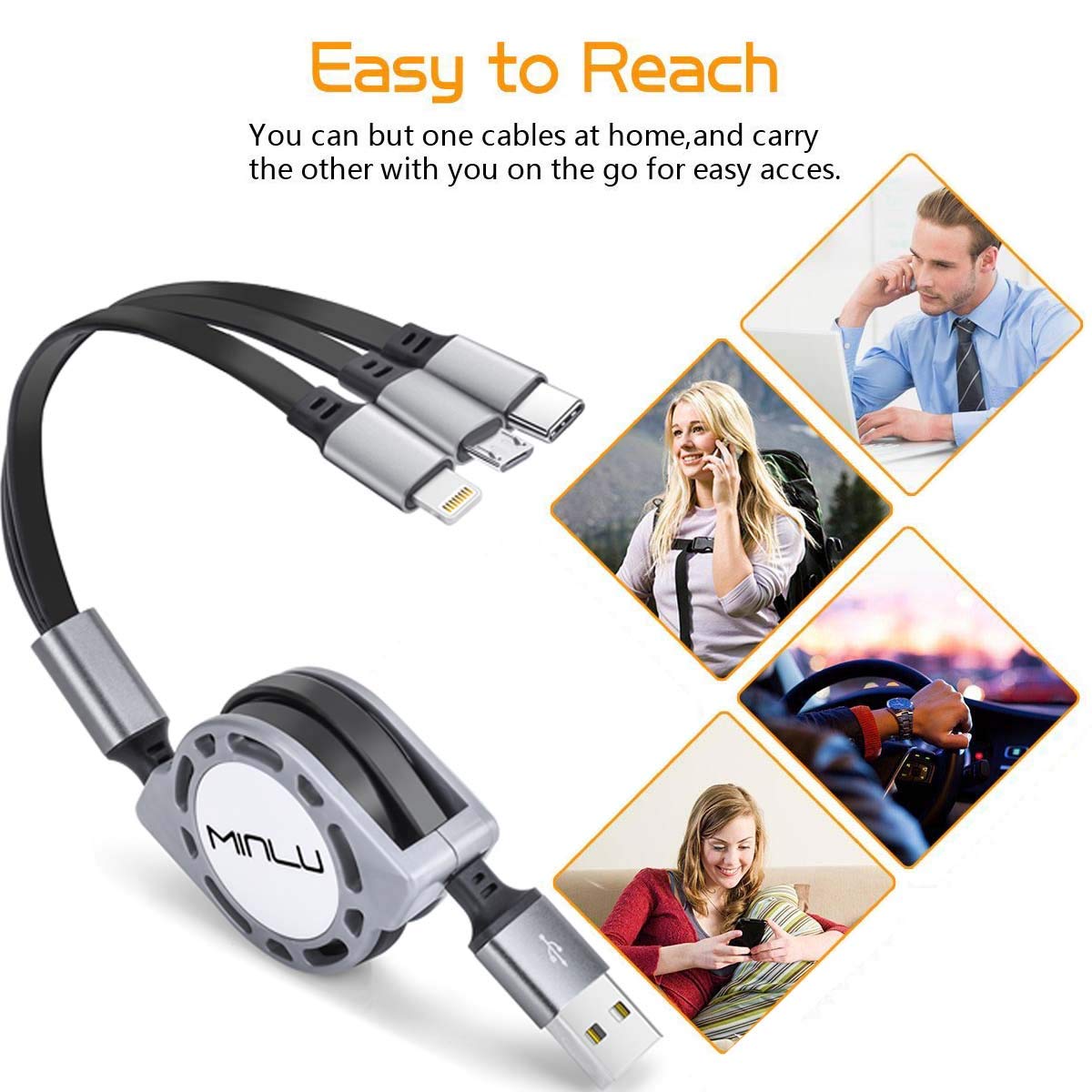 ● The durability you’ve come to expect from Minlu 3-in-1 Charger Cord—now with universal compatibility. With iP, USB-C and Micro USB connectors built-in, it’s the only cable you’ll ever need. Support to charger most of the mobile phones available on market.