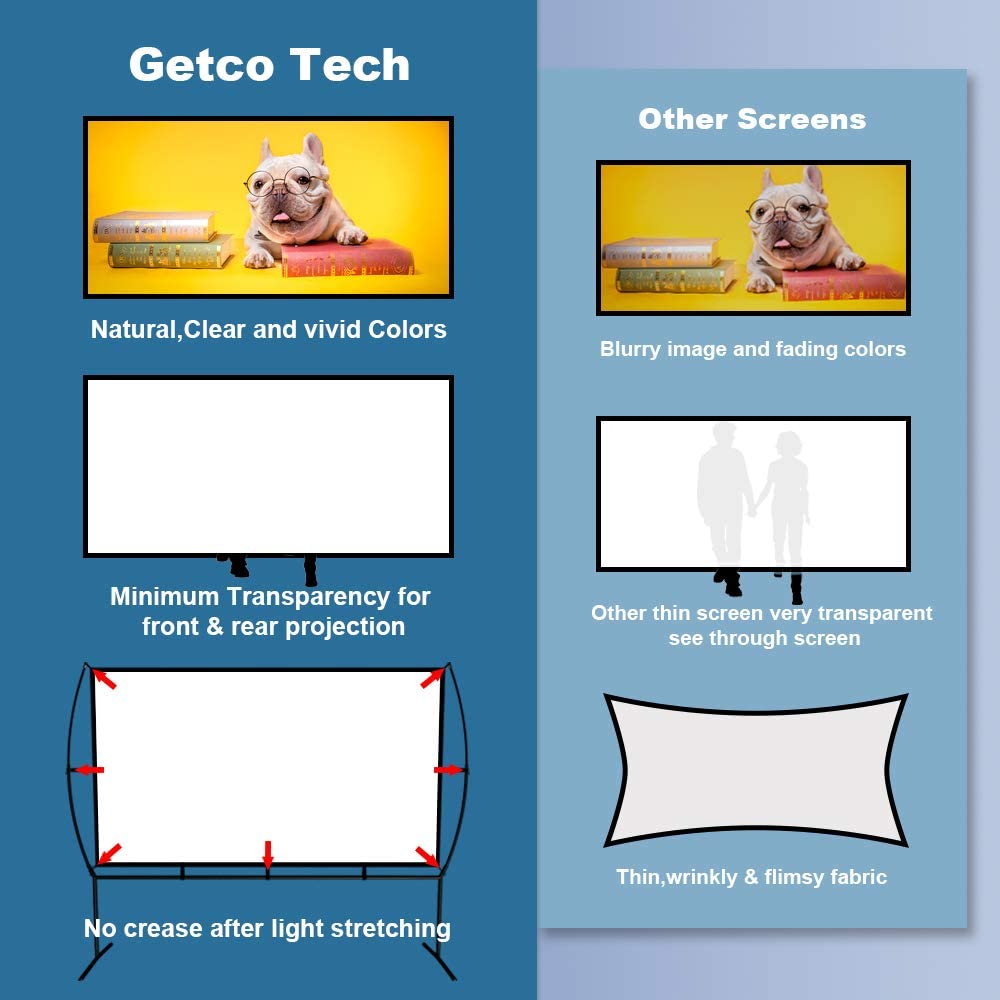 - GT GETCO TECH projector screen is arguably convenient outdoor projector screen to carry around. It is durable, with a very simple design. Set up and take down is simple and easy, taking only afew minute.