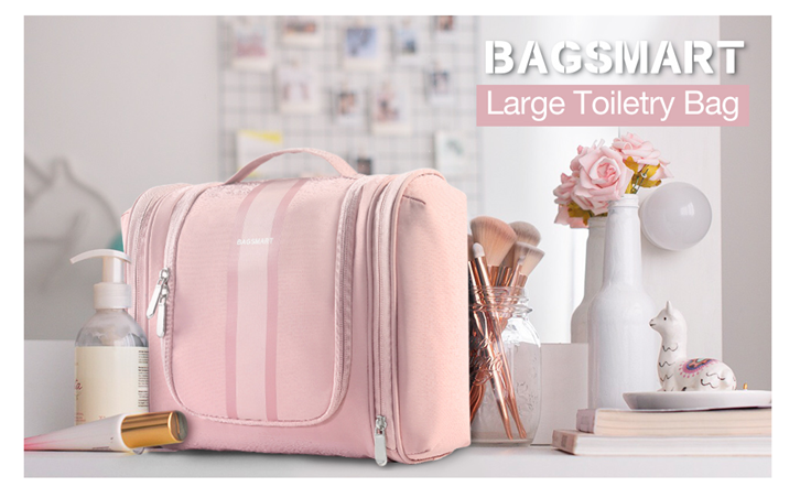 BAGSMART Toiletry Bag for Women, Travel Toiletry Organizer with hanging hook, Water-resistant Cosmetic Makeup Bag Travel Organizer for Shampoo, Full Sized Container, Toiletries, Pink