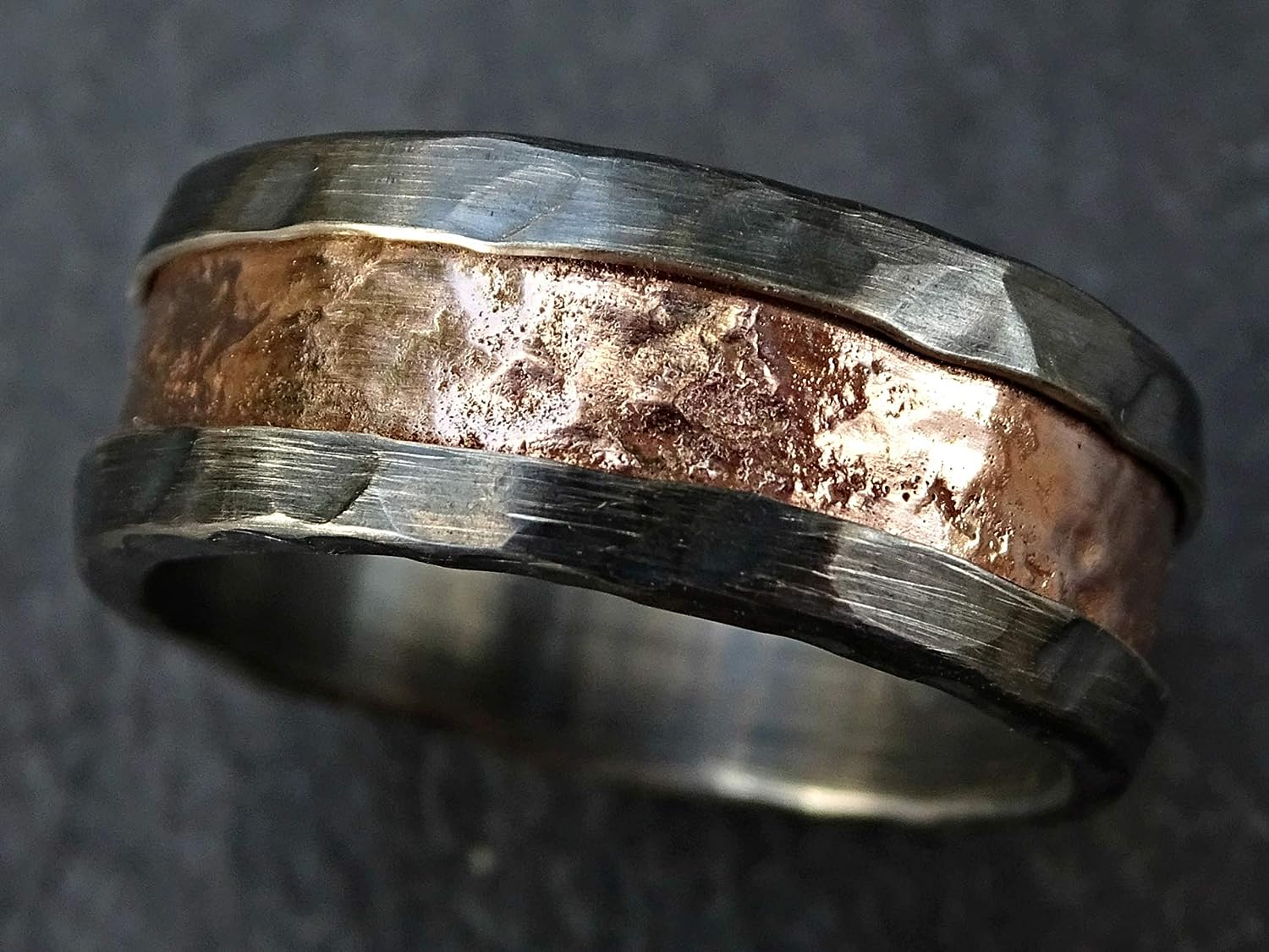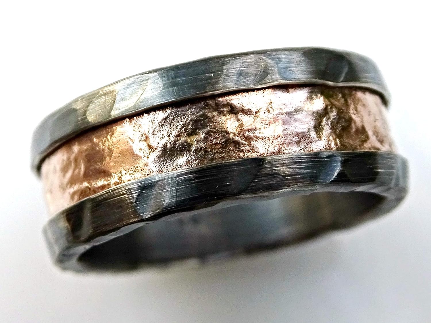 // Solid rose gold and silver ring with a unique surface, created by fire.