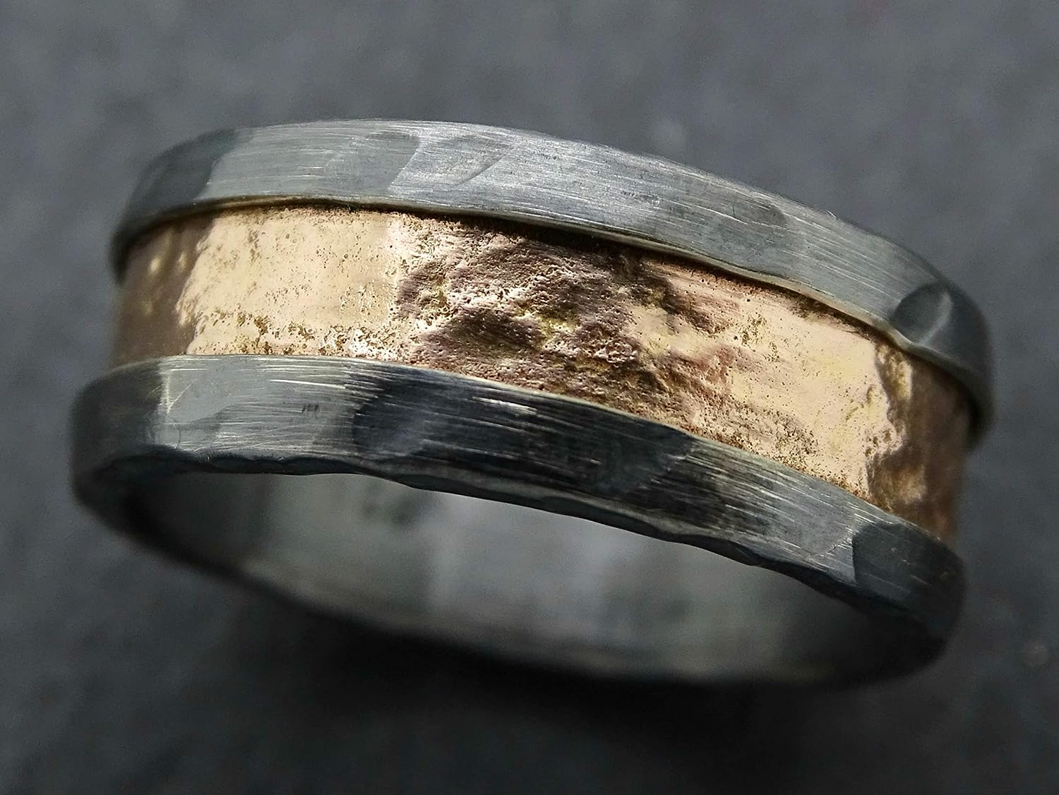The inlaid gold in the center of the ring has a unique rugged, molten structure.