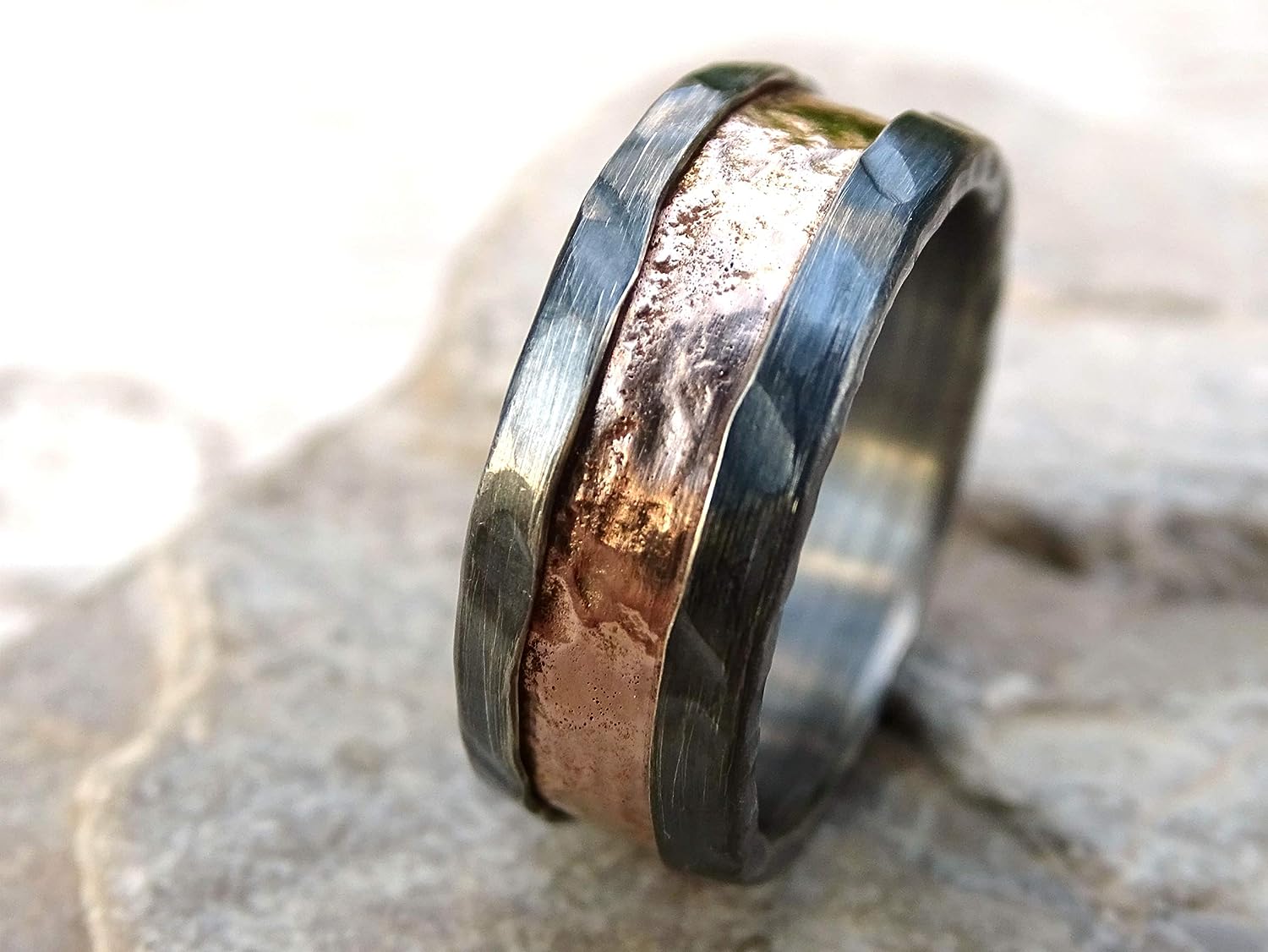 The silver lining is uniquely structured and hammered on the rim and the edges. The lining is very smooth and comfortable to wear. The ring band itself as well as the silver line is not even all around the ring with slimmer and wider parts which adds to the rustic character of the ring.