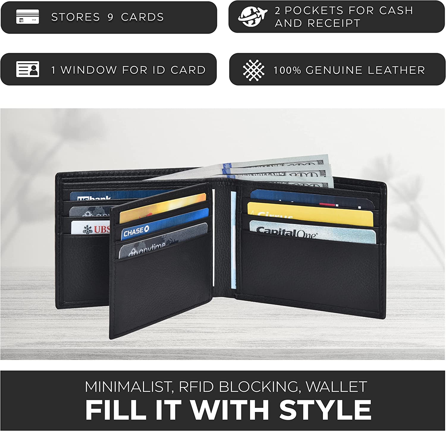 - ★PRACTICAL FEATURES : Comes in ONE_SIZE 3.5 x 4.35 x 0.75 inches. It has 9 Credit Card slots and 1 ID window, 2 Note compartment and 2 Extra Pocket for any documents you like. This wallet is unlike other wallet which has more than extra or less than required space.
