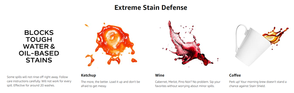 - Stain Shield technology blocks tough water- and oil-based stains before they start; just rinse with water & keep going. Stretch: Fabric stretches and moves with you for extra comfort.