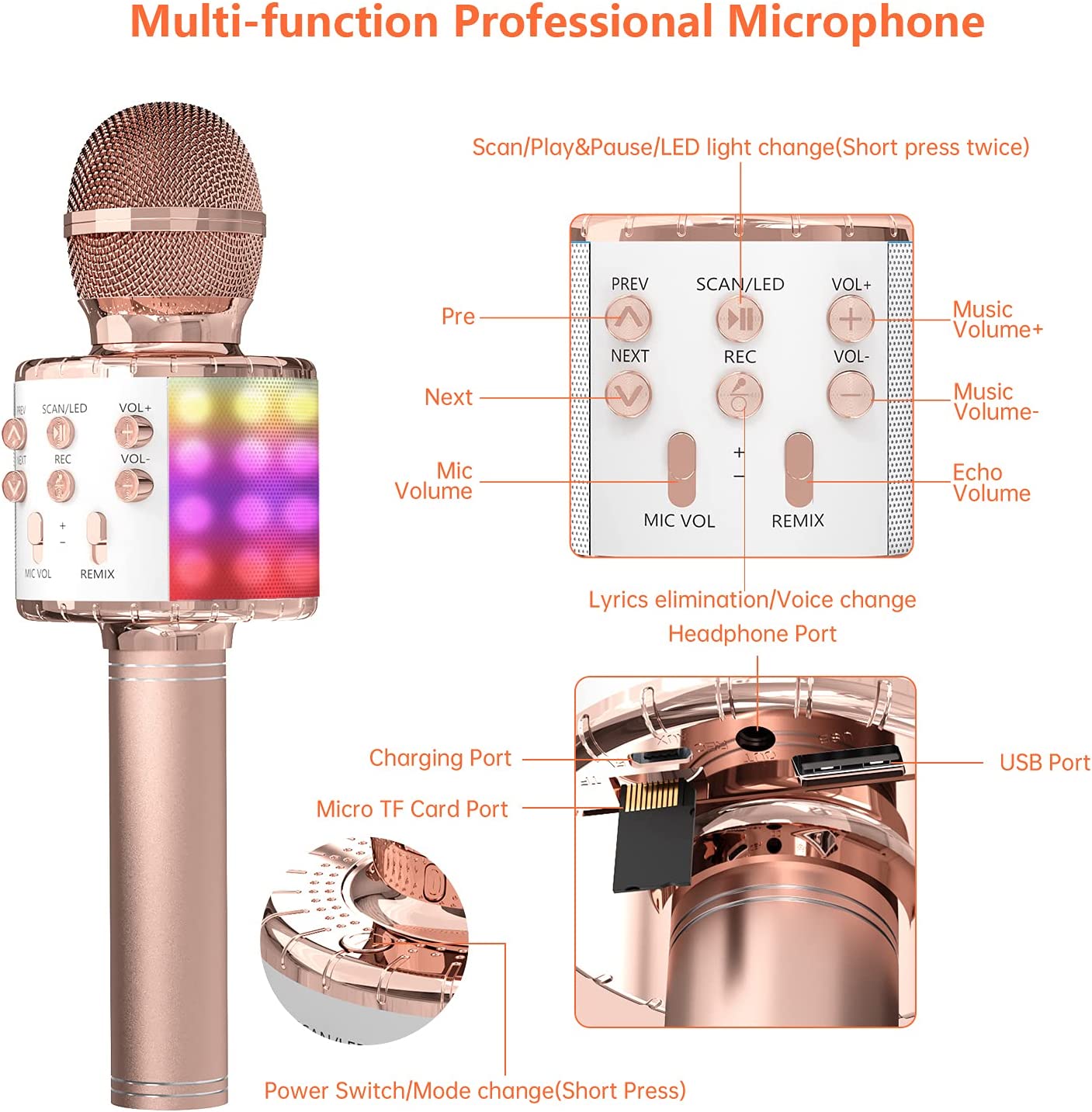OVELLIC Karaoke Microphone for Kids, Wireless Bluetooth Karaoke Microphone with LED Lights, Portable Handheld Mic Speaker Machine, Great Gifts Toys for Girls Boys Adults All Age (Rose Gold)