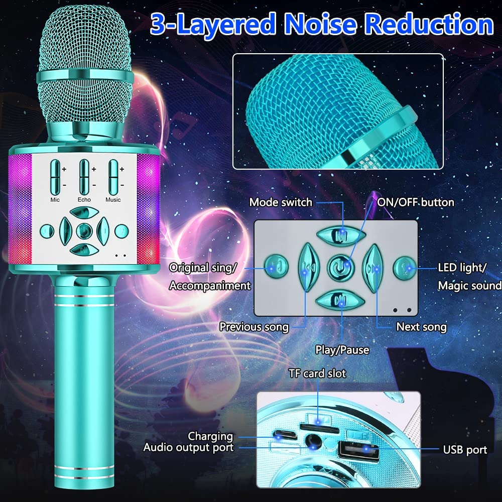 【All-in-One Karaoke Microphone Toy】Portable hand-held microphones can be used as microphone, karaoke machine, high quality speaker, voice changer, singing recorder. A convenient, multi-functional microphone toy that can bring kids fun anywhere, anytime.
