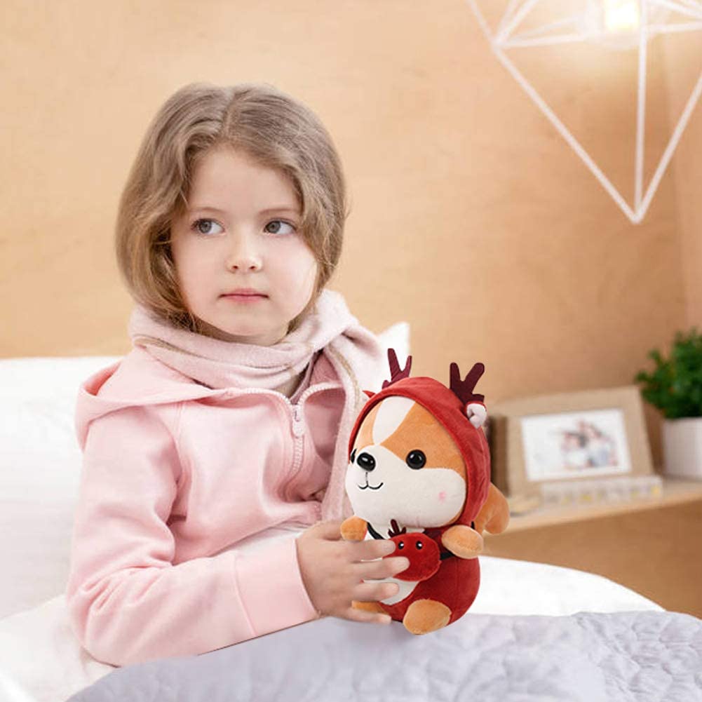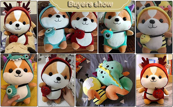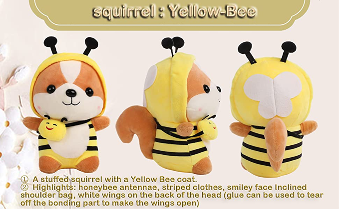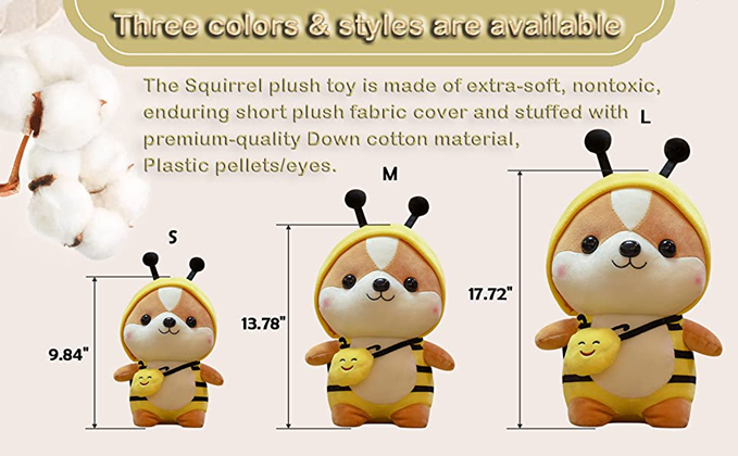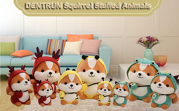• Cuddly Stuffed Animal: The squirrel stuffed animal is a soft and huggable plush toy. The cute squirrel transforms into cosplay doll, Red-Christmas Elk, Yellow-Bee, Green-Dinosaur.