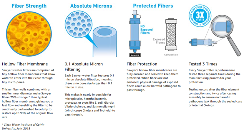 A lightweight, versatile personal filtration system, the second-generation Sawyer MINI Water Filter fits in the palm of your hand and has a total field weight of just 2 ounces. Perfect for everything from camping with the kids to traveling abroad where tap and bottle water can't be trusted, the tiny MINI provides 0.1 micron absolute filtration for clean drinking water on the go — filtering out bacteria, protozoa, and microplastics. The MINI filter removes 7 log (99.99999%) of all bacteria (like salmonella) as well as other harmful bacteria which causes cholera and E. coli and 6 log (99.9999%) of all protozoa such as giardia and cryptosporidium. These removal rates equal or exceed other filter options. EPA guidelines allow ten times more protozoa left in the water than Sawyer MINI filters allow. The MINI also filters out 100% of microplastics. The MINI 0.1 micron absolute filter houses a cluster of micro-fibrous tubes which use similar technology found in medical dialysis. As water passes through the side walls of the tubes, harmful bacteria and protozoa are trapped on the outer walls so you can be confident your water is safe to drink. Great for outdoor recreation, hiking, camping, scouting, domestic and international travel, and emergency prepping, the Sawyer MINI gives you a number of ways to access clean water. Attach it to the included drinking pouch, use the included straw to drink directly from your water source, connect it to hydration pack tubing (sold separately), or screw it onto standard disposable bottles (28mm thread). Since 1984, Sawyer Products has offered the best, most technologically advanced solutions for protection against sun, bugs, water, and injuries — everything from first aid kits developed for wilderness to point-of-use water filters that filter contaminated water to levels cleaner than U.S. bottled water.