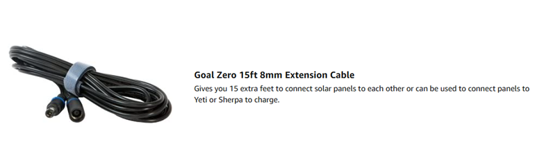 Gives you 15 extra' To connect Goal Zero boulder Or nomadic solar panels to each other. Can also be used to connect panels to Yeti power stations or Sherpa power Pack to charge.
