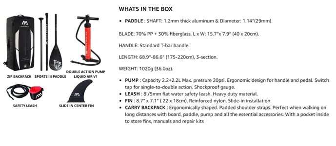 | Included Components | Safety Leash, Stand Up Paddle Board, Central Slide-in Fin, Double Action High-Pressure Pump, Sports iii Alloy 3 Piece Paddle |