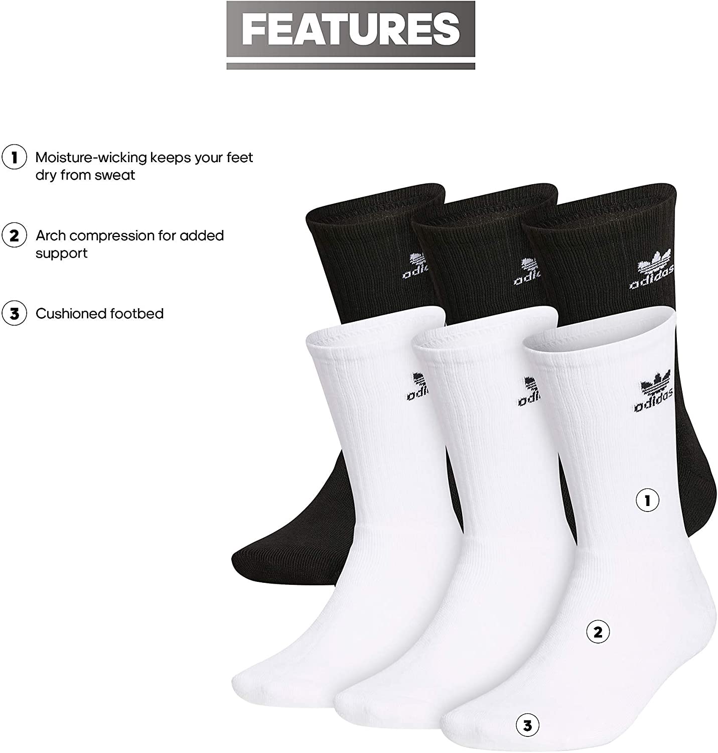 The trefoil crew is all about clean, comfortable style. Cushioning in the foot gives you the comfort and durability for everyday wear, arch compression will keep the sock snug and secure on your foot, and moisture-wicking will keep your feet dry from sweat.