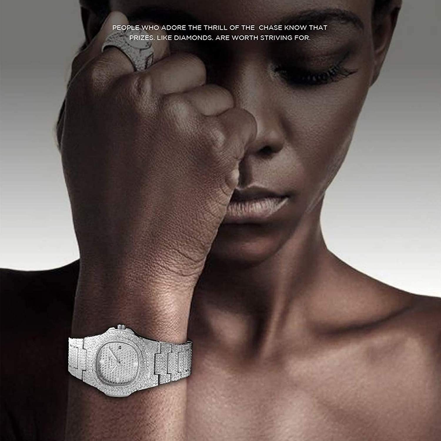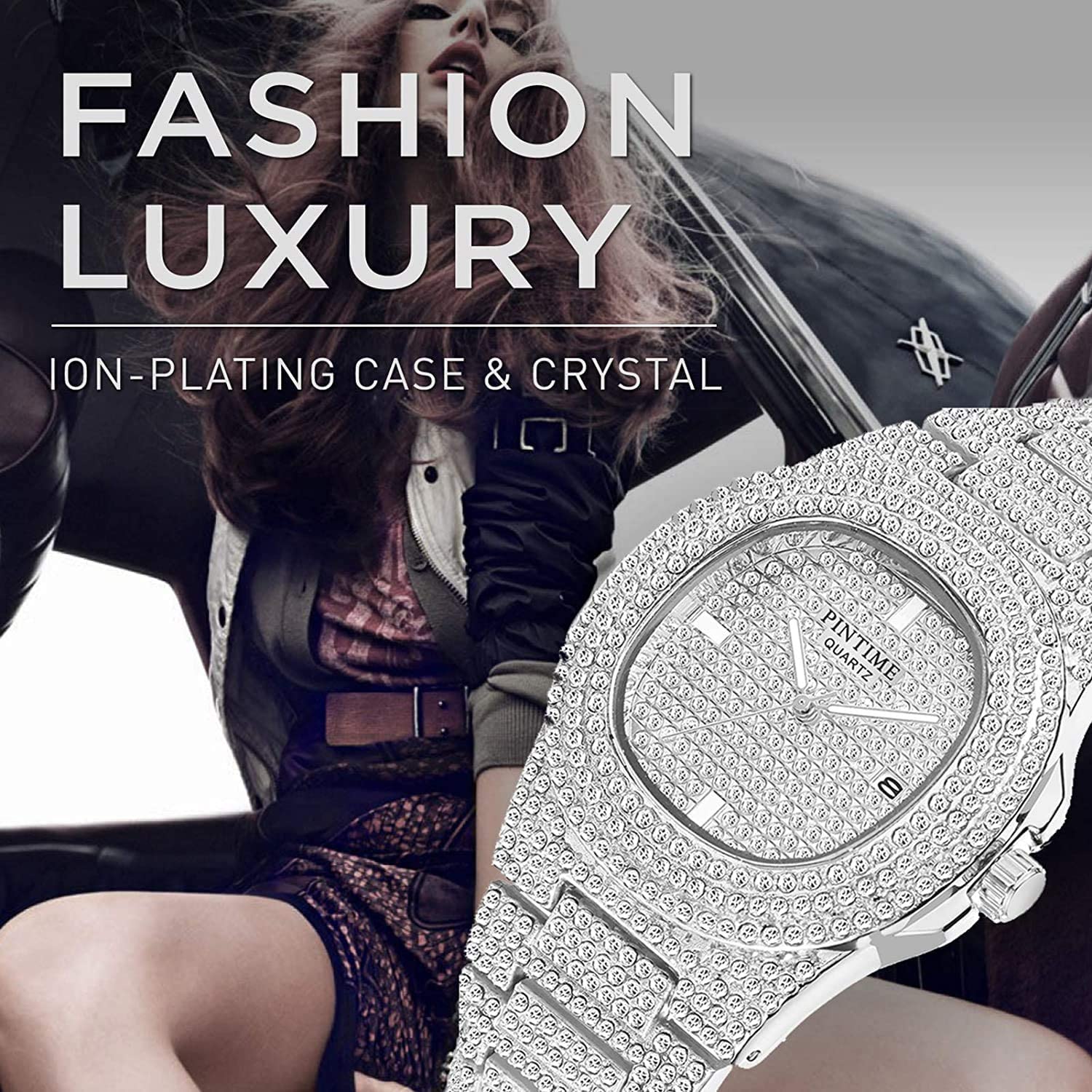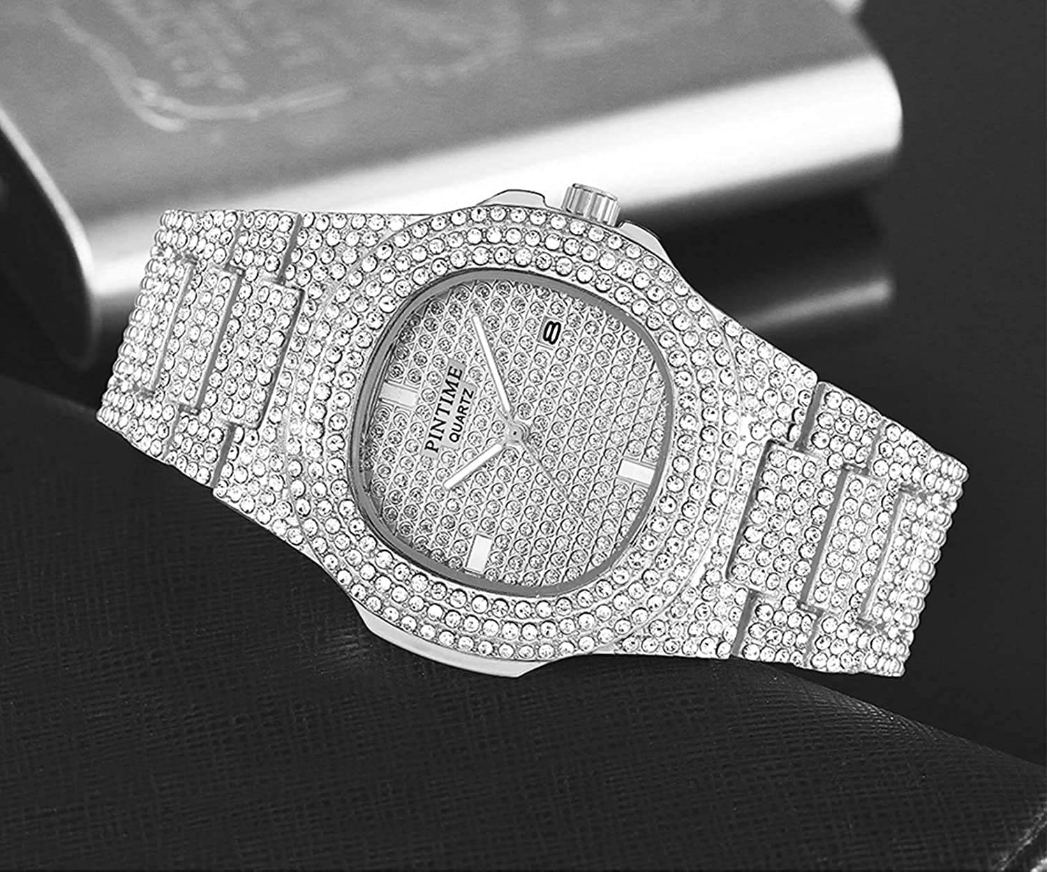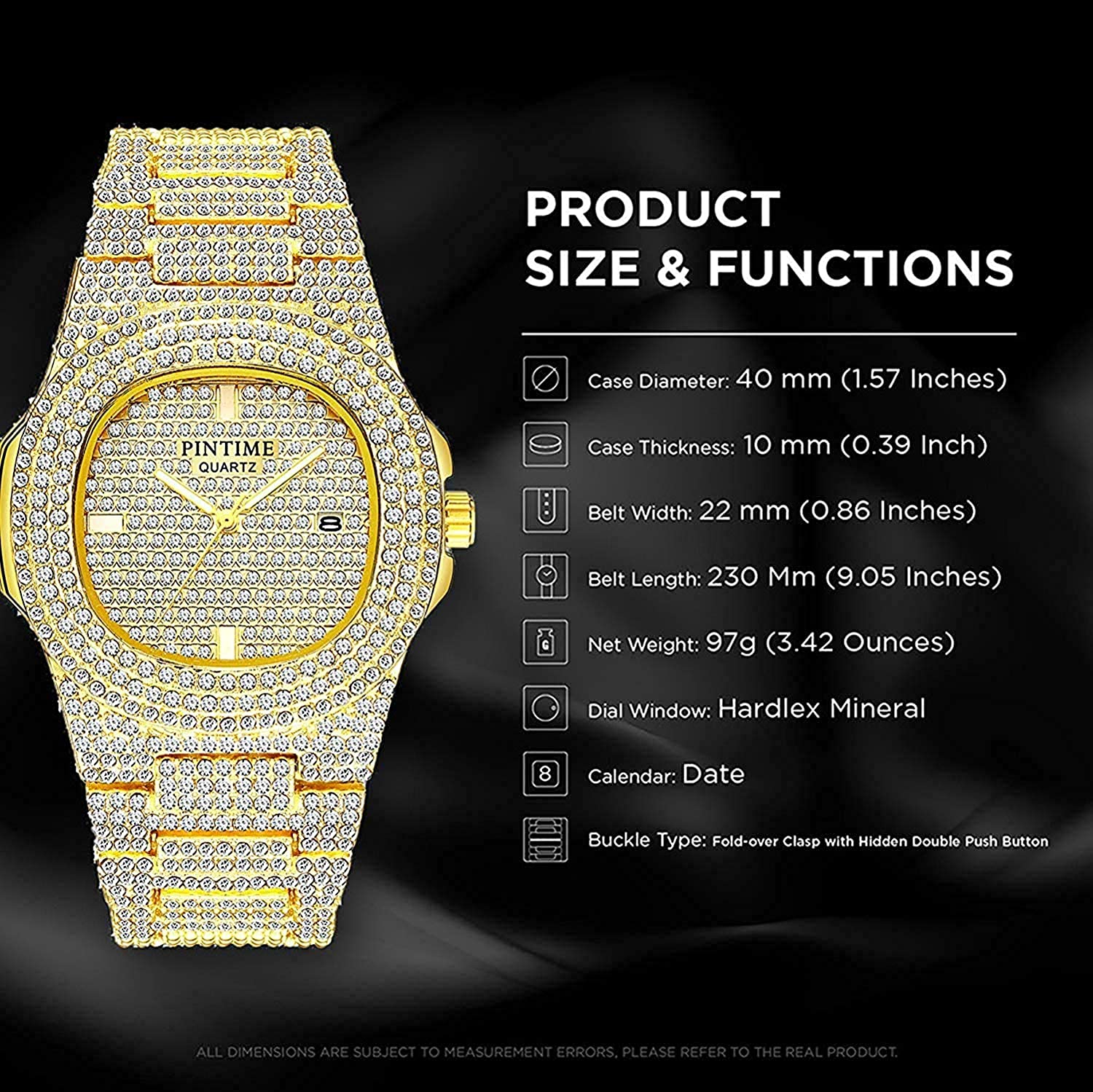 • Crystals on watch are simulated diamonds. Push button hidden clasp. Watch Band can be made smaller by jeweler or yourself. There are a simple band removal tool in the watch box.