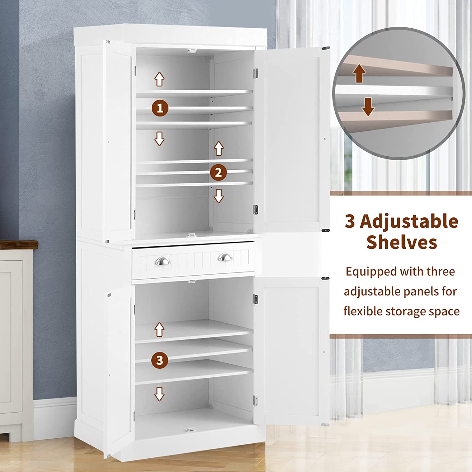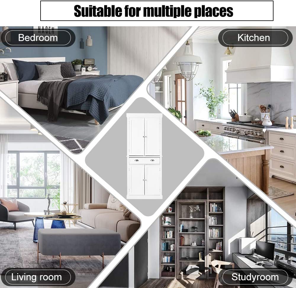 【STORAGE SPACE TO MEET DEMAND】This kitchen pantry is equipped with a large drawer and 2 double-door cabinets. There are three adjustable shelves inside the cabinet, and you can easily adjust the height of the shelves according to the different items you need to place. Different heights can meet the placement needs of various items. The drawer is equipped with smooth sliding rails, which can be easily opened and closed. You can put dishes, books and other small items in the spacious drawer.