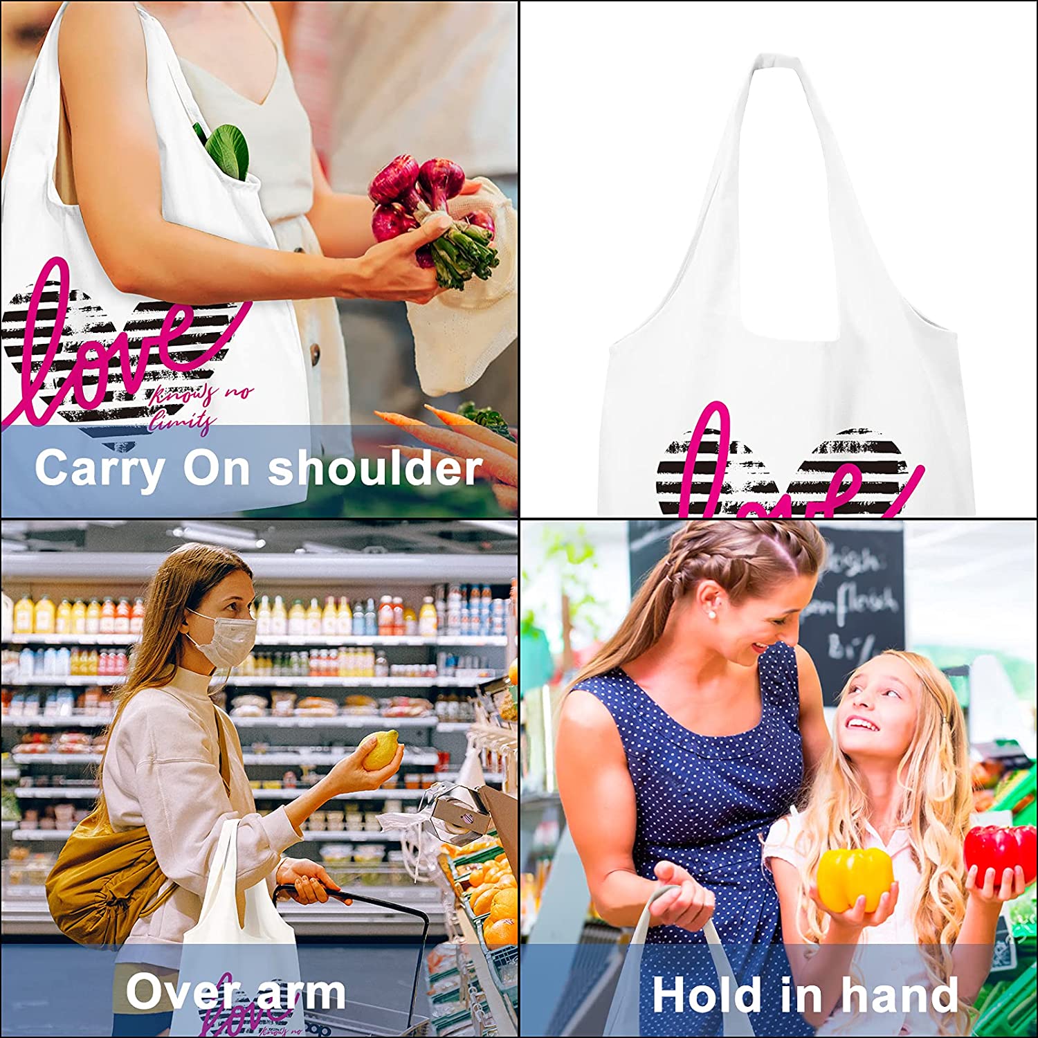 - X-Large Capacity: Canvas tote bags are very big which can hold up to 50+ pounds of groceries and replaces 2-3 conventional grocery bags. Long handles of the reusable shopping bags allow for hand holding or carry on the shoulder for easier carrying. The foldable aesthetic tote bag is perfect for shopping, groceries, travel, storage and practical for daily use.