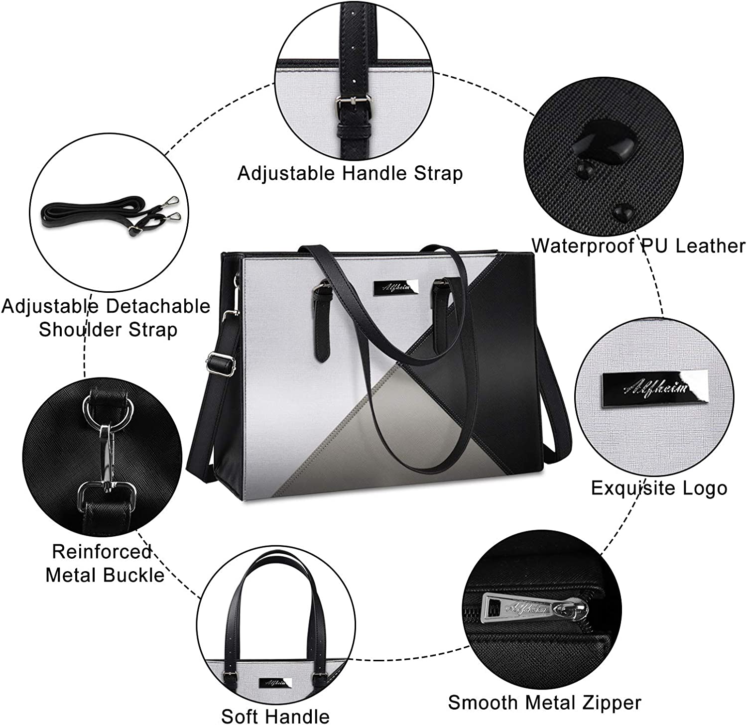 【Premium Material】Alfheim laptop bag is made of premium PU leather and polyester lining. High-quality leather makes laptop handbags for women water-repellent, scratch-resistant and more soft and durable. Adopting a sturdy top handle zipper and professional padded pocket which keep your laptop and essentials safe. The fashionable stitching color makes this large business woman bag become a forefront of fashion trends.