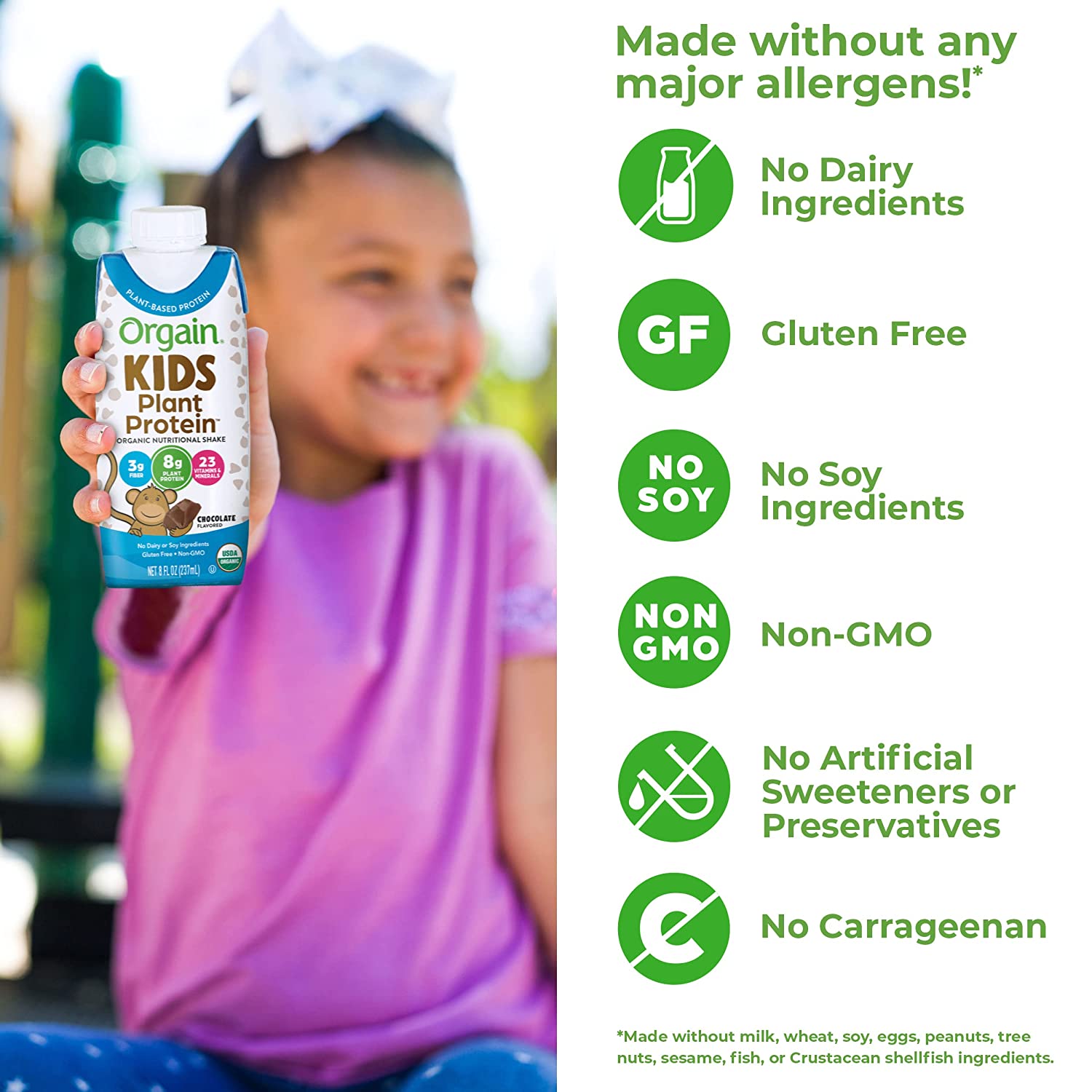 • USDA organic, gluten free, vegetarian friendly, soy free, kosher, non GMO, carrageenan free, peanut free. Free of all artificial colors, flavors, and preservatives