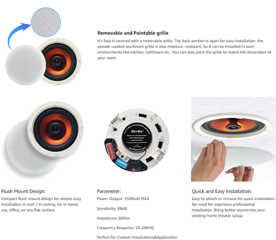 the HCS-628 Ceiling speakers doesn’t consume the space in the room, which can be utilized for either other pieces of furniture or could be left vacant to increase the visual appeal of the room setting . the speakers disappear from view as they no longer require to be placed on the floor or any pedestal or take placed in the room.