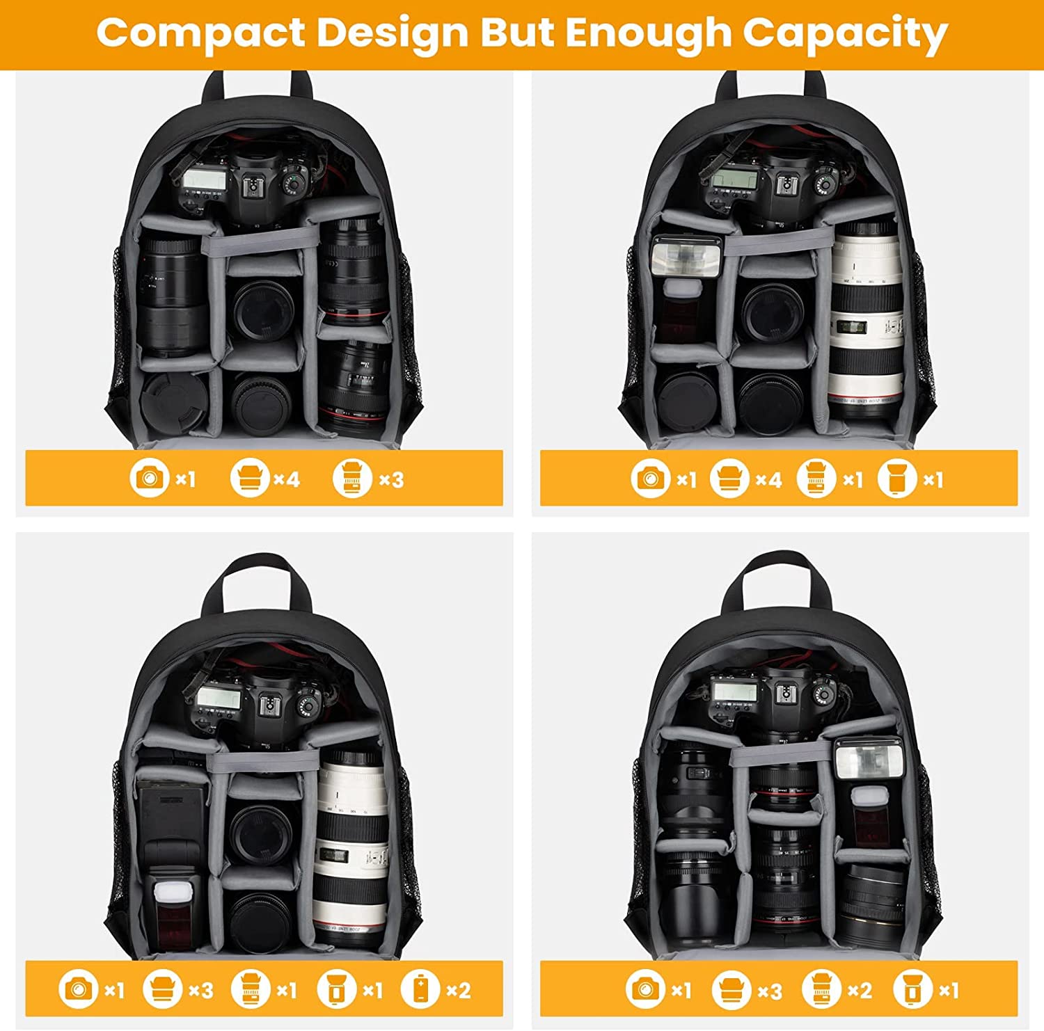 - 【COMPACT DESIGN BUT ENOUGH CAPACITY】 This camera and lens bag provides 7 rooms with 6 pieces padded removable dividers and 1 security strap which can hold 1 camera 6 lenses, while you can DIY the inner space by removing the thick dividers based on your equipment. Inside there is a dedicated sleeve for a 13" laptop or tablet/iPad. Bottom straps for tripod attachment. The front of the camera gear backpack has a zippered pocket for accessories. Mesh pockets on both sides for bottle and umbrella.