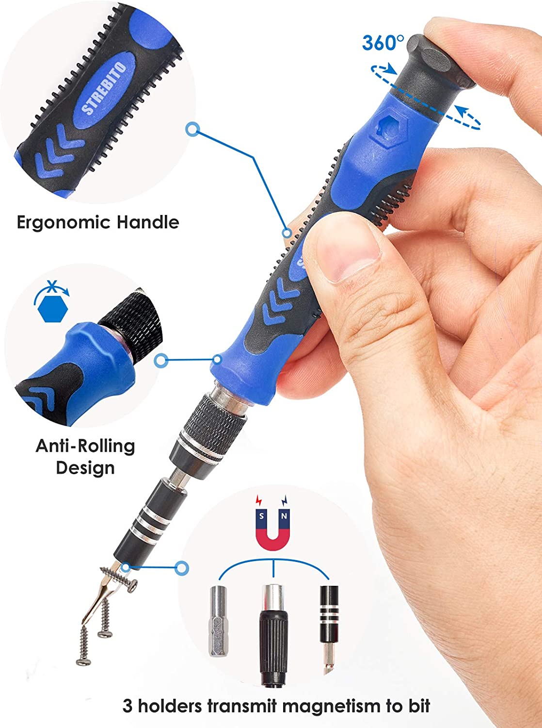 - 【Humanized Design】The small screwdriver kit has been upgraded for maximum humanization, makes your repair job easier and more efficient. Super smooth swivel cap allows you to apply constant pressure while rotating. The PP+TPR handle is ergonomic designed to provide comfortable grip and enough torque. Magnetic bit holder transmits magnetism through the screwdriver bit, helping you handle tiny screws and electronic parts
