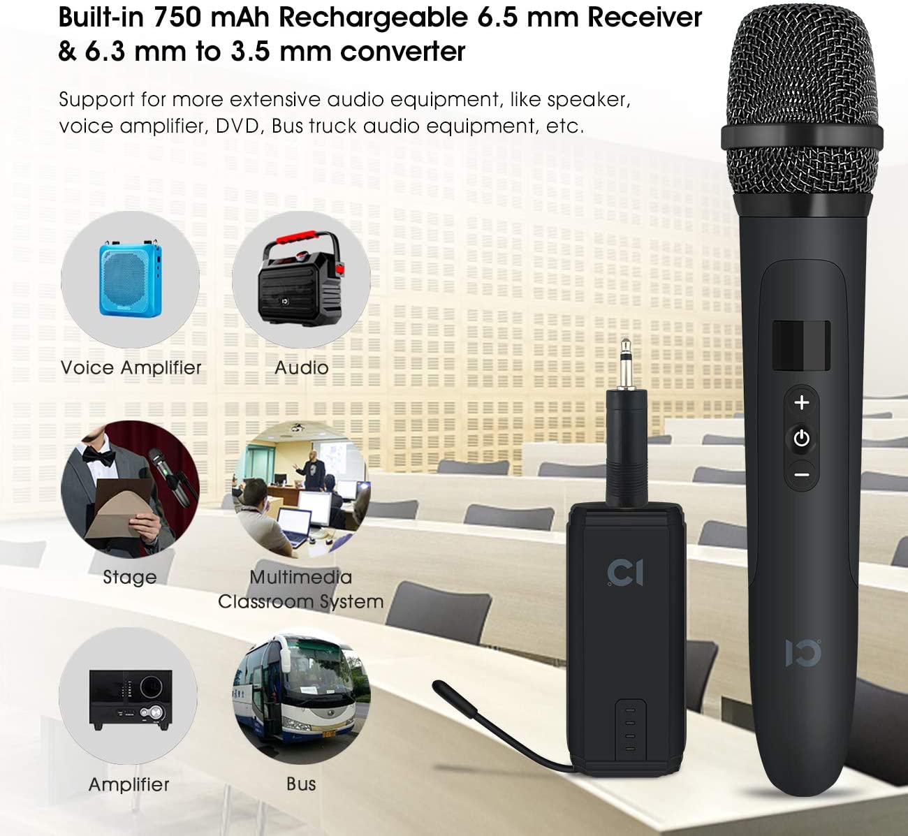 ✔Suitable for any audio devices with 6.5mm microphone jack or 3.5mm MIC hole (6.5 mm to 3.5 mm converter is included) for wireless amplification;