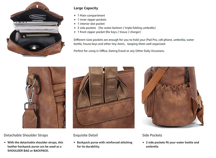 【DIMENSIOIN & WEIGHT】:(L)13.50" x(W) 6.25" x (H) 14.25", Weight: 2.09 LB; removable strap is 12.11".The Large designer leather backpack allows you to fit items easily.