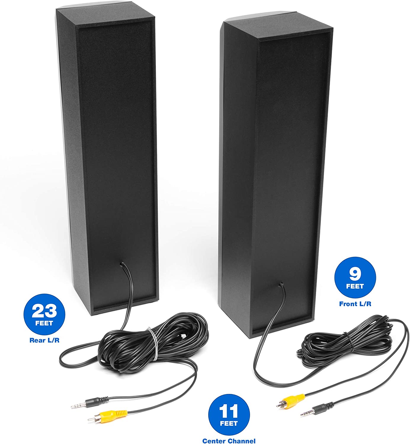 Speakers - 1 center channel: Two 3” speakers, four 3” full range front channel speakers, four 3” full range rear channel speakers, one 8” subwoofer tower, independent speaker/subwoofer volume control