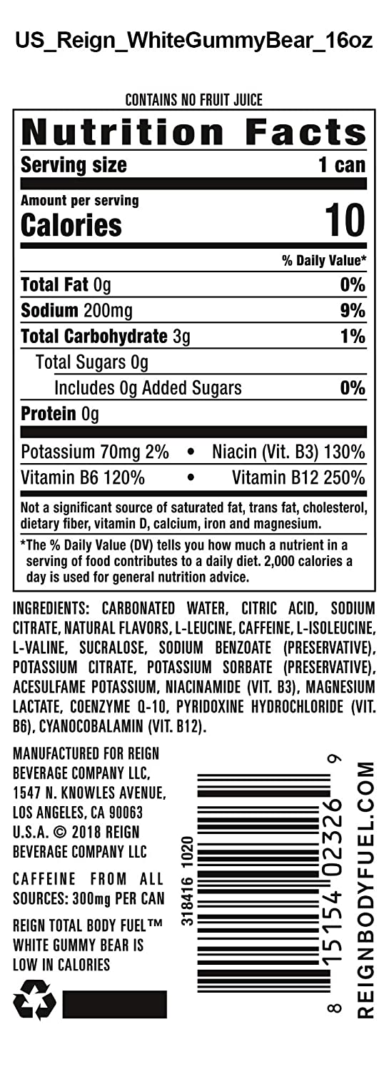 The ultimate fitness focused beverage, blended with BCAAs, 300 mg of natural caffeine, coq10 and electrolytes, reign total body fuel is designed for your active lifestyle. Offering zero sugar, 10 calories, and zero artificial flavors and colors, reign is the ultimate fitness-focused beverage to support your high-performance needs
