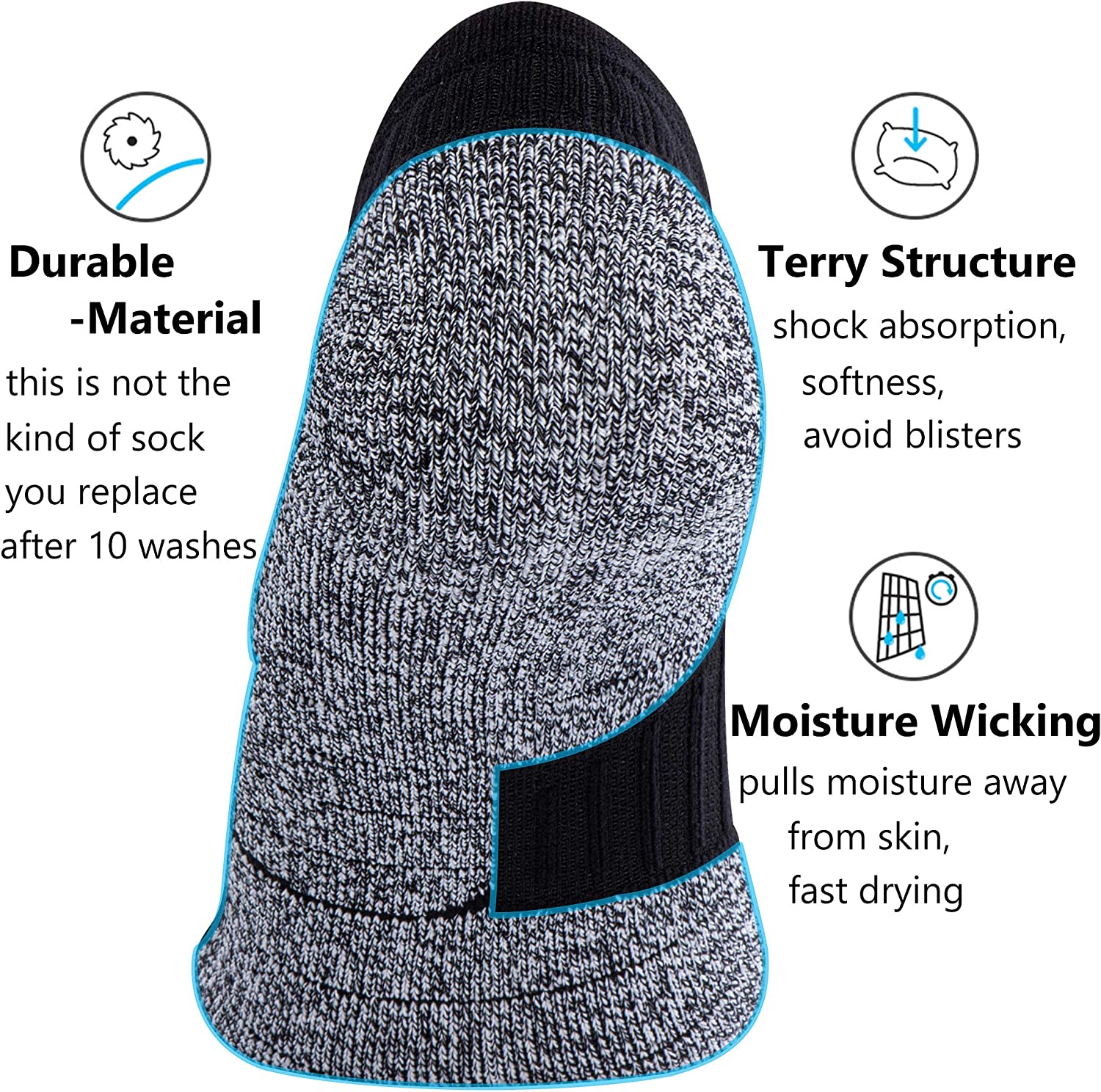 - EXCELLENT SOLE DESIGN: Terry structure, shock absorption, softness, avoid blisters, breathable; Moisture wicking and durable material, pulls moisture away from skin, fast drying, this is not the kind of sock you replace after 10 washes; Unique airflow structure design (Distinguish left and right feet), dry and comfortable