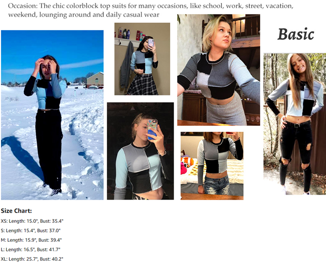 Features: Color block design, long sleeve, round neck, ribbed knit crop top for women and teen girls