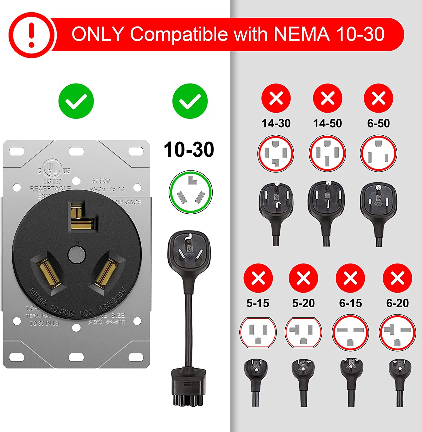 - 【ELECTRICAL RATING】 30A, 125/250V, max wattage 7500 watts, 10 feet, STW NEMA 10-30P male plug and NEMA 10-30R female receptacle, for 3 prong dryer outlet.