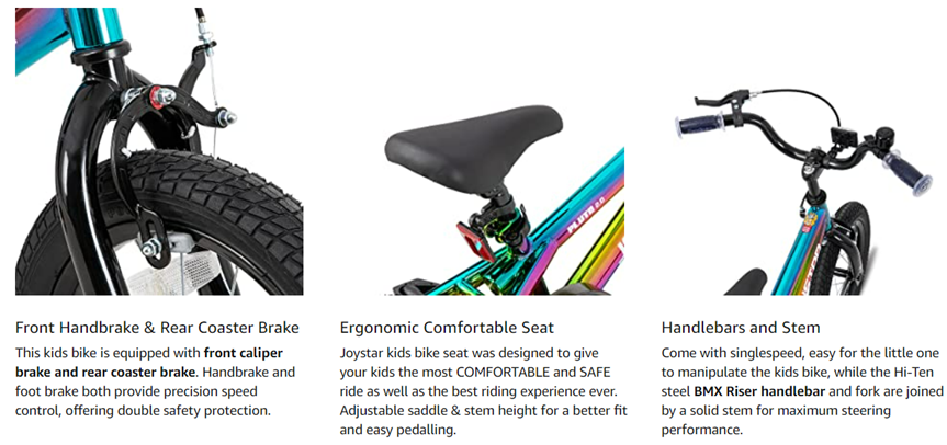 - 1. Amazing Design and Color! JOYSTAR PLUTO 2.0 Kids bike for boys girls with Bright dazzling colors, stylish and charming. DIY decals add extra fun to the ride. Soft seat offers more comfort in riding.