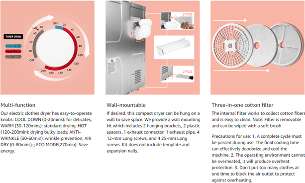 - 【Multi-function】 Our electric clothes dryer has easy-to-operate knobs and seven drying modes: COOL DOWN (0-20mins): for delicates; WARM (30-120mins): standard drying; HOT (120-200min): drying bulky loads; ANTI-WRINKLE (30-60min): wrinkle prevention; AIR DRY (0-80mins); INTELLIGENT: Portable dryer can adjust the heating time according to humidity; ECO MODE: Save energy.