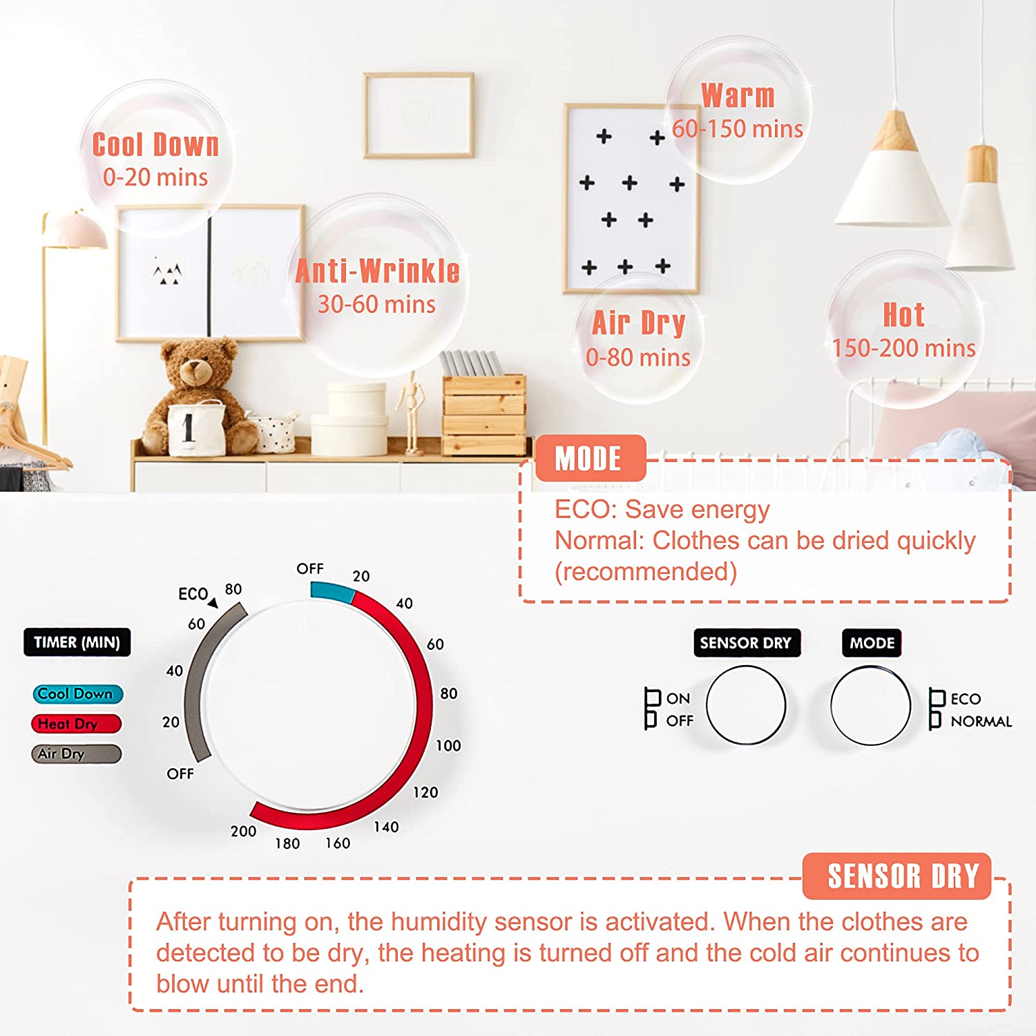 - 【ECO modes】starting with 150 minutes of cold air, followed by 120 minutes of hot air.In ECO mode, if the knob does not start to rotate from 70 minutes, you need to manually unplug the power supply, the dryer will stop working.Different from the normal temperature blowing in the last twenty minutes of normal mode, no matter whether SENSOR DRY is turned on or not, ECO mode will use the humidity sensor to judge in the last twenty minutes. If the clothes are not dry enough, it will be hot air.