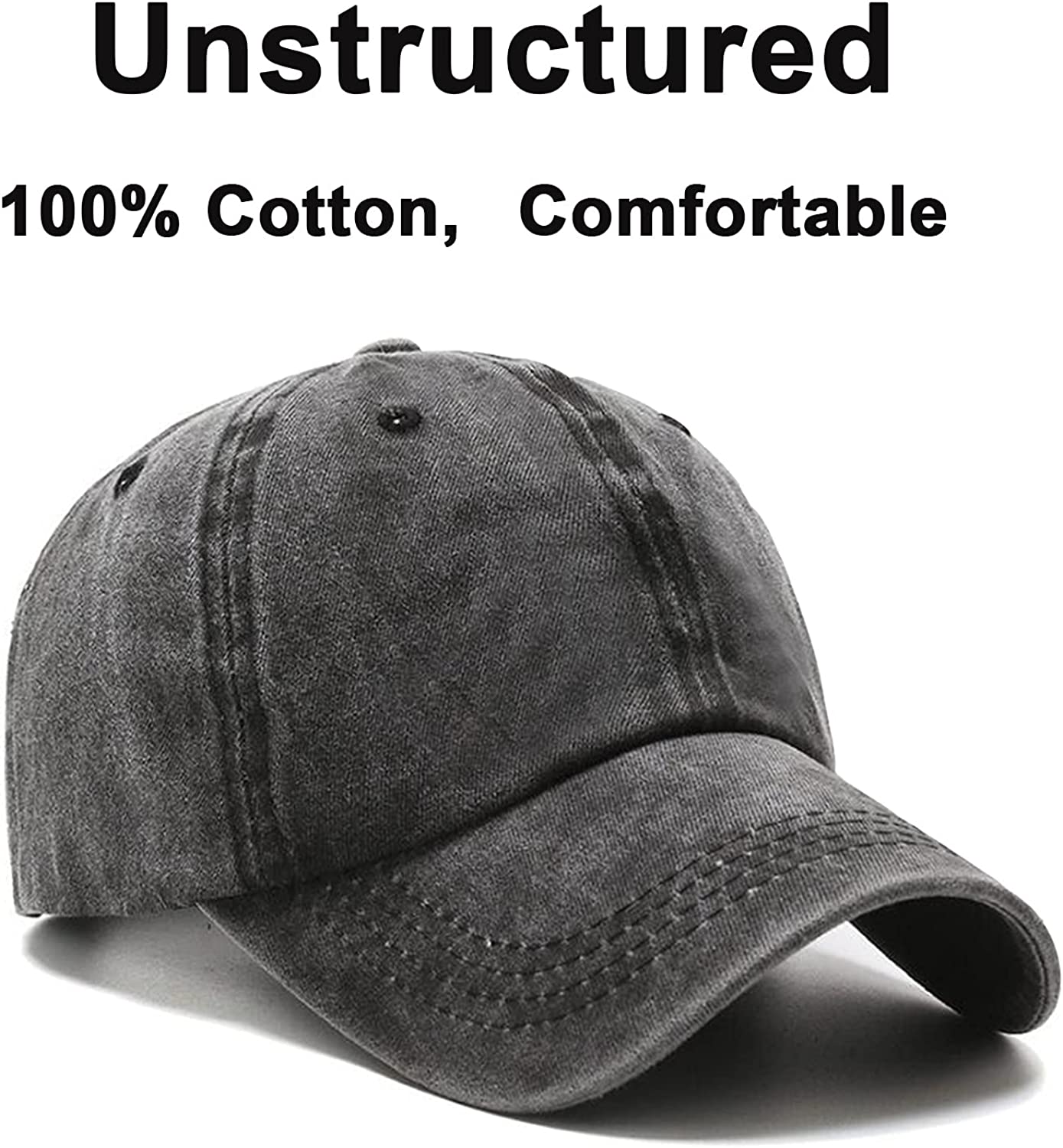 Vintage washed distressed cotton baseball cap, classic and timeless style. Soft fabric in washed style, 99% cotton made, soft, lightweight denim fabric, make sure better comfort wearing. Dad Hat, Low Profile UNCONSTRUCTED.