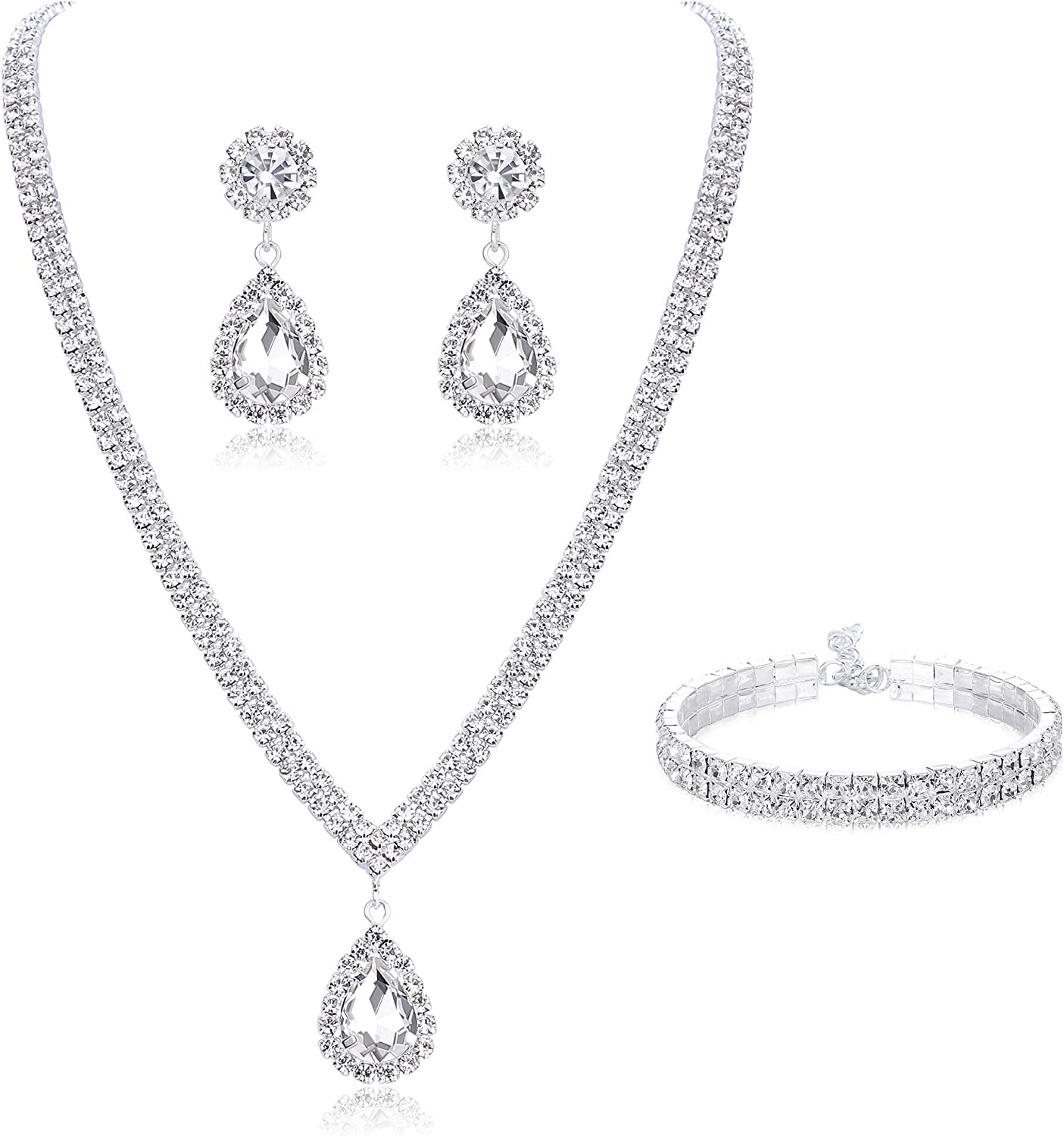 Subiceto Bridal Jewelry Set for Wedding Simple Necklace Teardrop Dangle Earrings Bracelets Crystal Prom Bridal Bridesmaid Tennis Jewelry Set