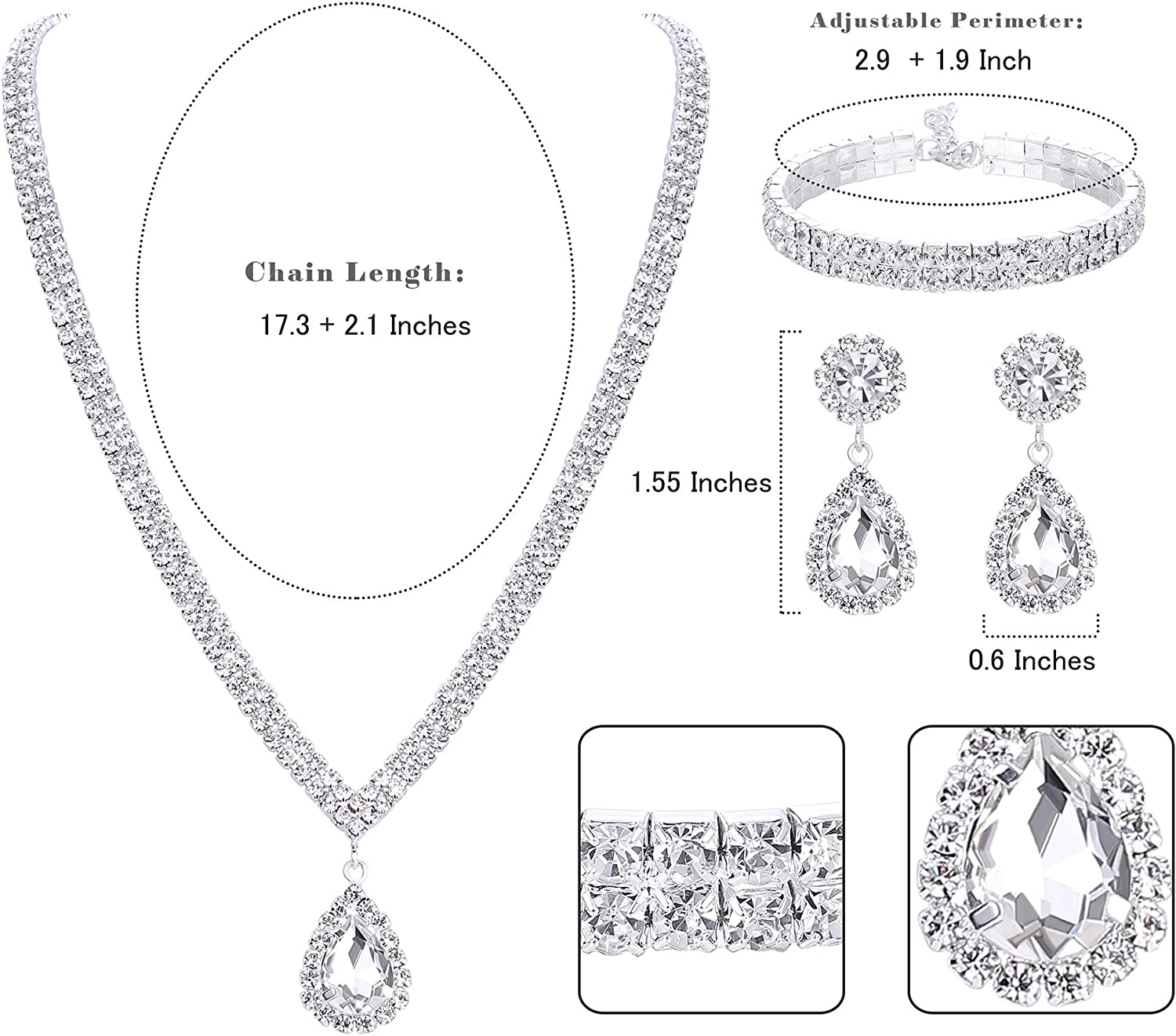 • ❤Size -- Bracelet length 2.9+1.9 Inches extension chain, necklace length 17.3 + 2.1 Inches extension chain, earrings total length 1.55 Inches Flexible and considerate design. Fashionable for you to wear in any occassion, like wedding, party, valentine's day or other festivals, also could match with formal dress, casual and so on.