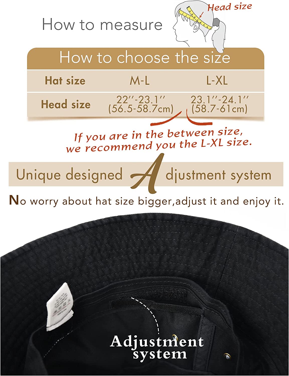 • Cotton beach bucket hat have two sizes of head circumference,adjustable with Velcro.(Size M: 22.05-22.8" ,Size L: 22.8-23.6".