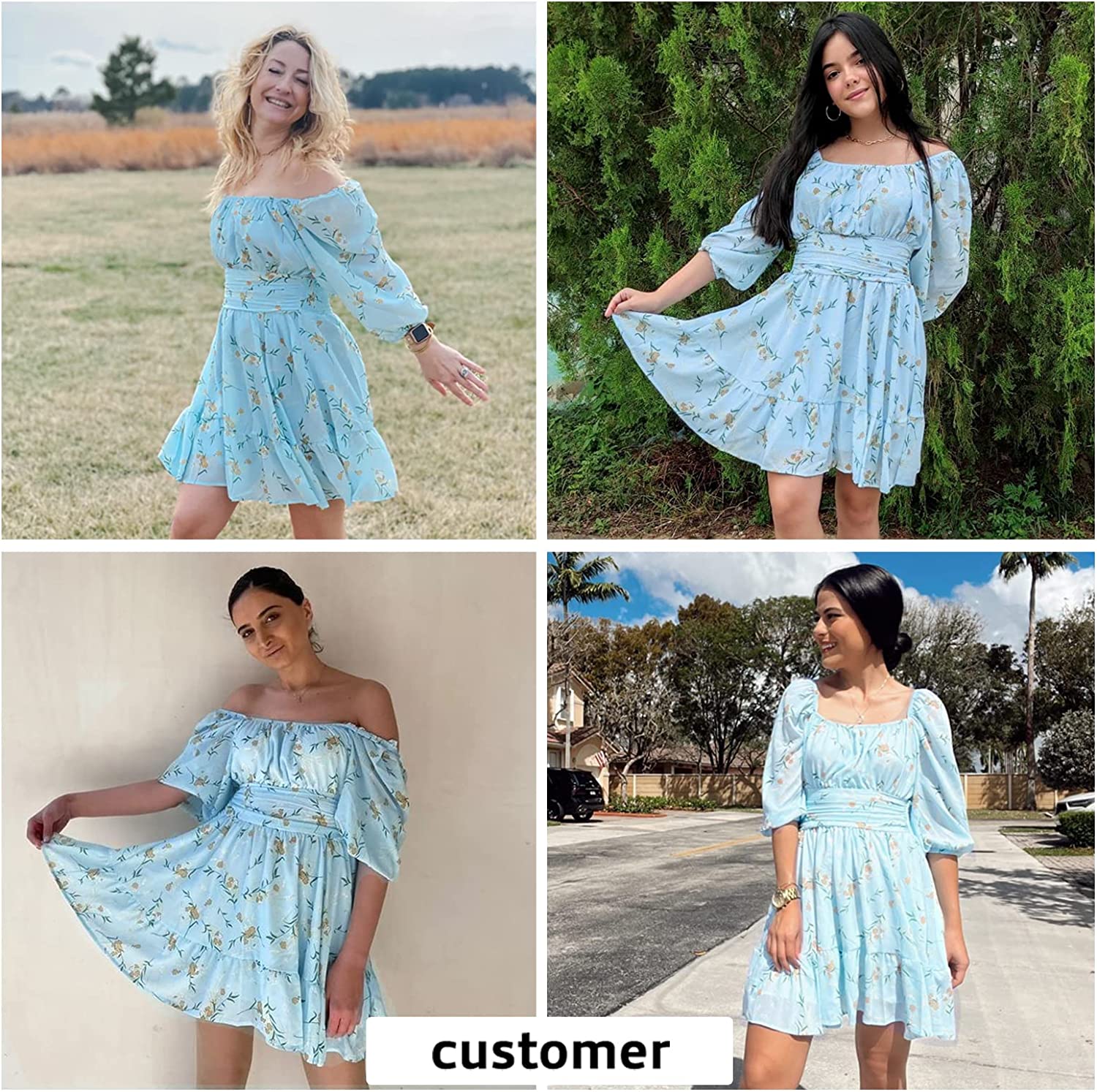 • Design: square collar and lantern sleeves bring a retro style. The sleeves can be pulled down for a cute off-shoulder look. The elastic smocked waist dress shows the body curves. Sexy open back with adjustable self-tie bowknot. Pretty ruffle hemline finish.