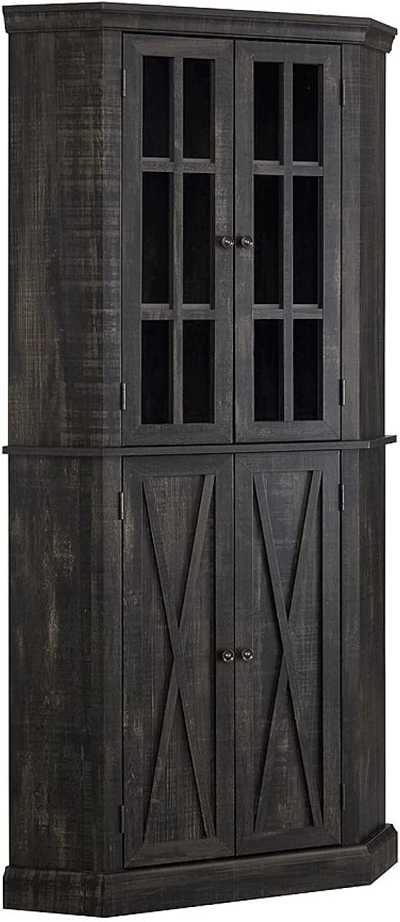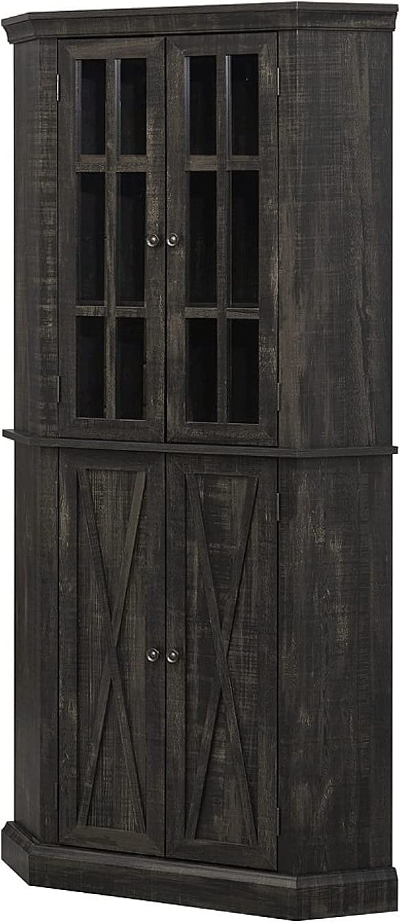 The base of this unit features two wood doors with barn look and four shelves for any other items you need to store