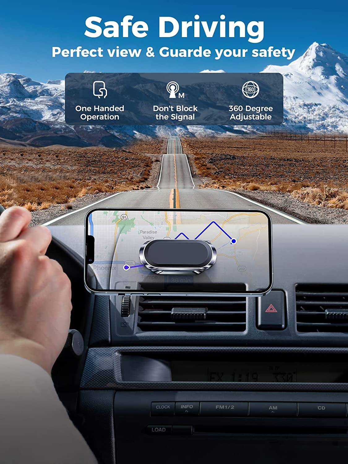 ?【2022 Upgrade Powerful Magnetic】Built-in 8 N52 super high-powered magnets (N52>>N50>N48), Small size while providing a large magnetic field. It can hold big phones steadily, even when you are driving through potholes. Meanwhile, the closed magnetic field would not affect the phone signal. Totally free your hands, so please enjoy the safe and comfortable driving time.