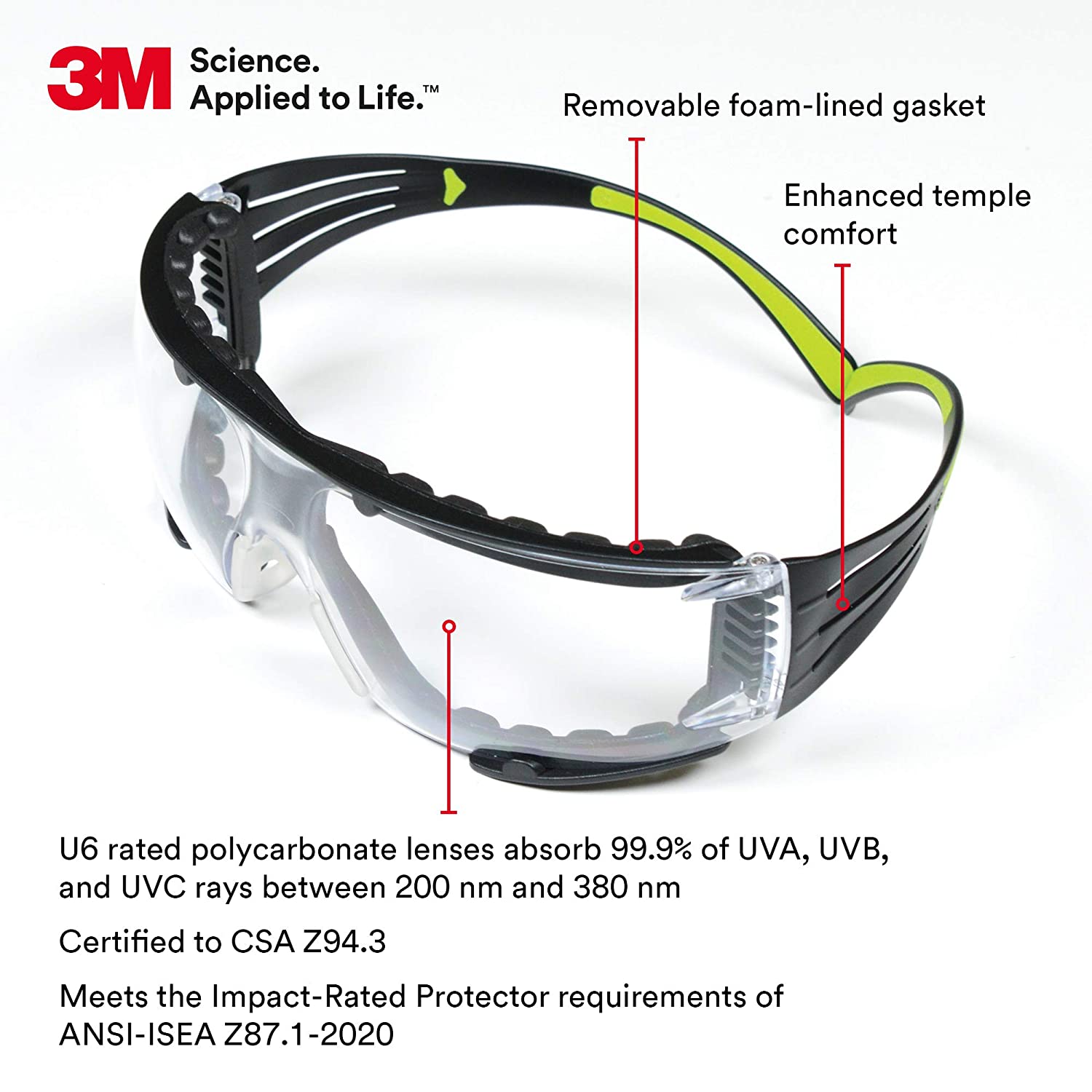 3M SecureFit Protective Eyewear is designed to diffuse pressure over the ears through 3M’s proprietary Pressure Diffusion Temple Technology. The glasses automatically adjust to the head and facial features of the wearer. Weighing less than 1 ounce, the durable, snug fitting, flexible nature of SecureFit offers a more comfortable and personal fit than old fashion “one size fits all” glasses. The snug fit also keeps the glasses securely in place as the wearer looks up and down or side to side, eliminating the need for frequent repositioning. The anti-fog coating on the lenses helps reduce the chances of fogging in hot and humid environments. Removable foam lined gasket helps keep debris out of your eyes while providing comfort and cushioning. Meets the High Impact Requirements of CSA Z94.3-2007 and the High Impact Requirements of ANSI Z87.1-2020.